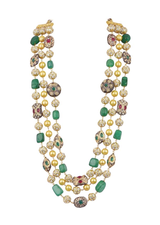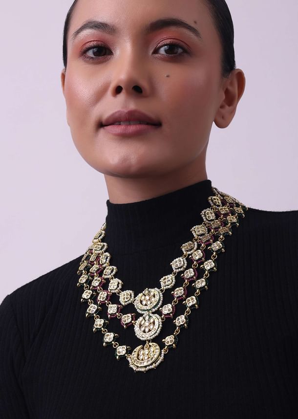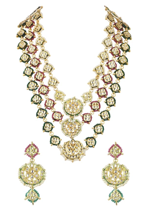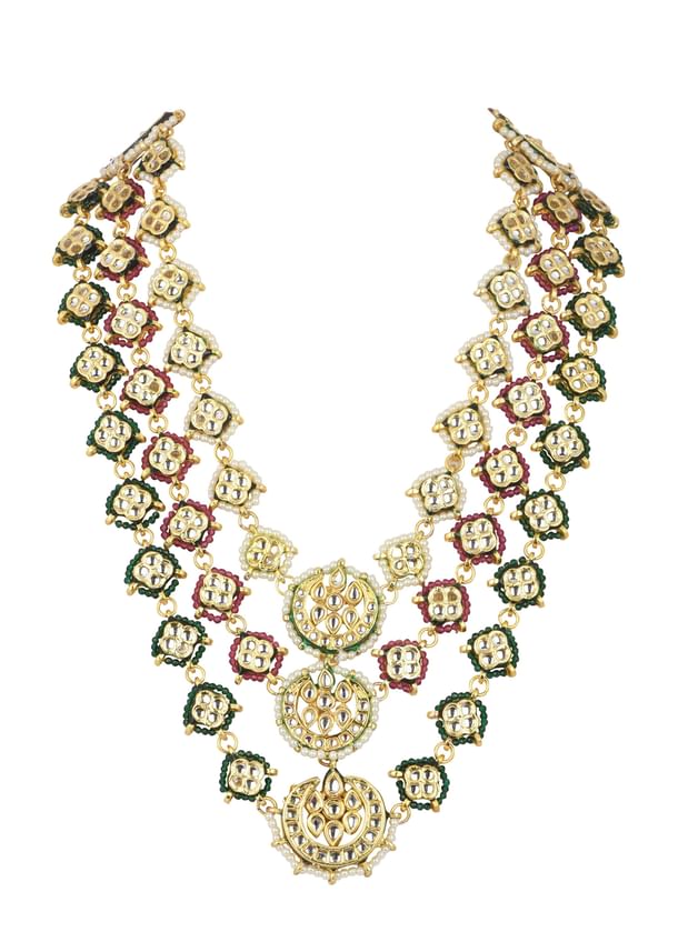 Green And Red Layered Kundan Necklace Set In Mix Metal