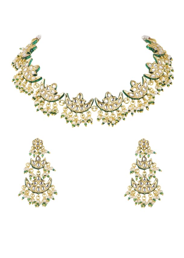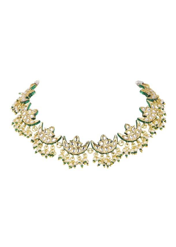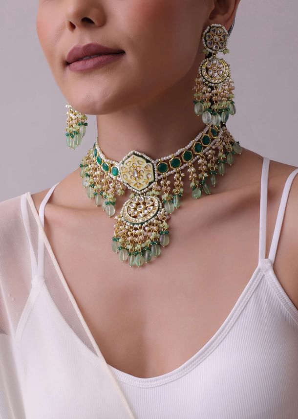 Green Toned Gold-Finish Kundan Choker Necklace Set With Colourful Meenakari Work In Mix Metal