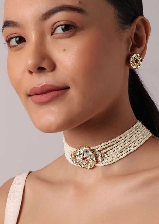 Gold-Finish Kundan Choker Necklace Set With Intricate Colourful Meenakari Work In Mix Metal