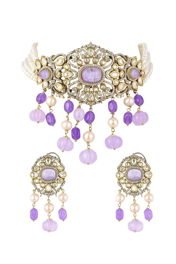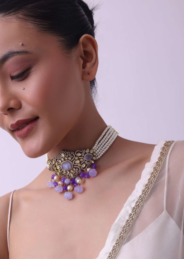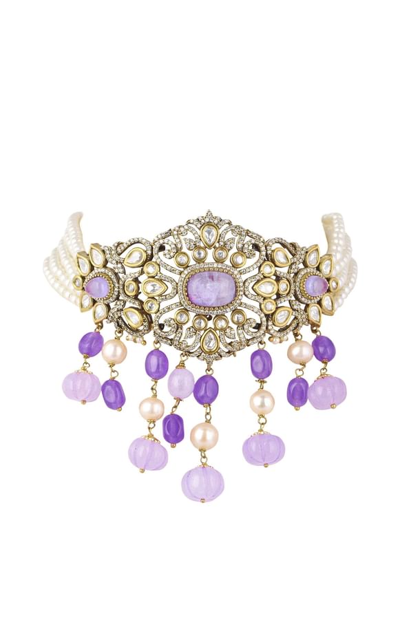 Two Tone Finish Kundan Choker Set In Mix Metal