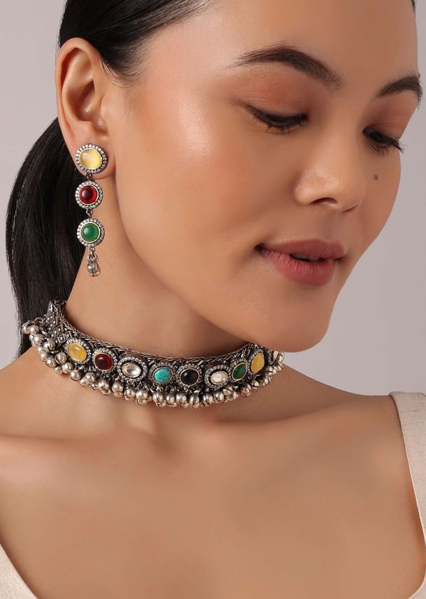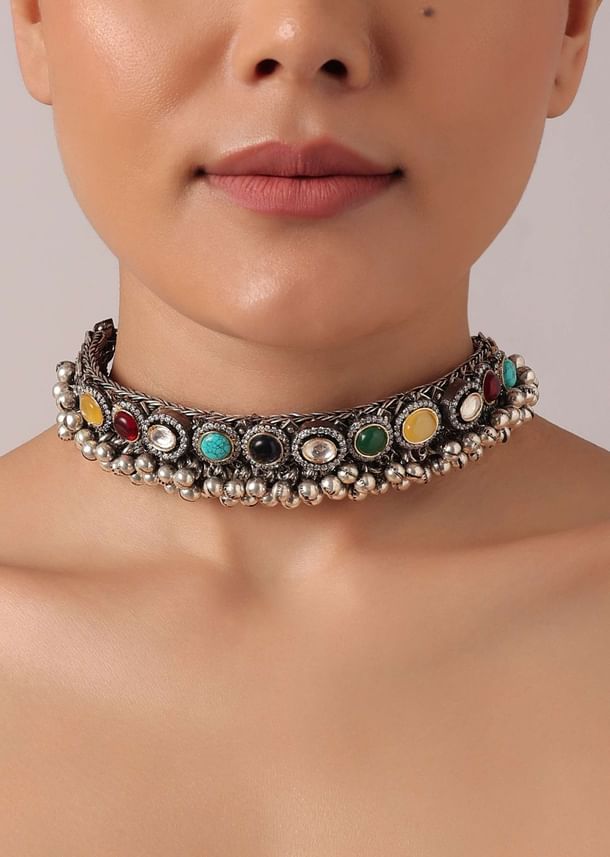 Two Tone Finish Oxidized Choker Set With Multicolor Stones