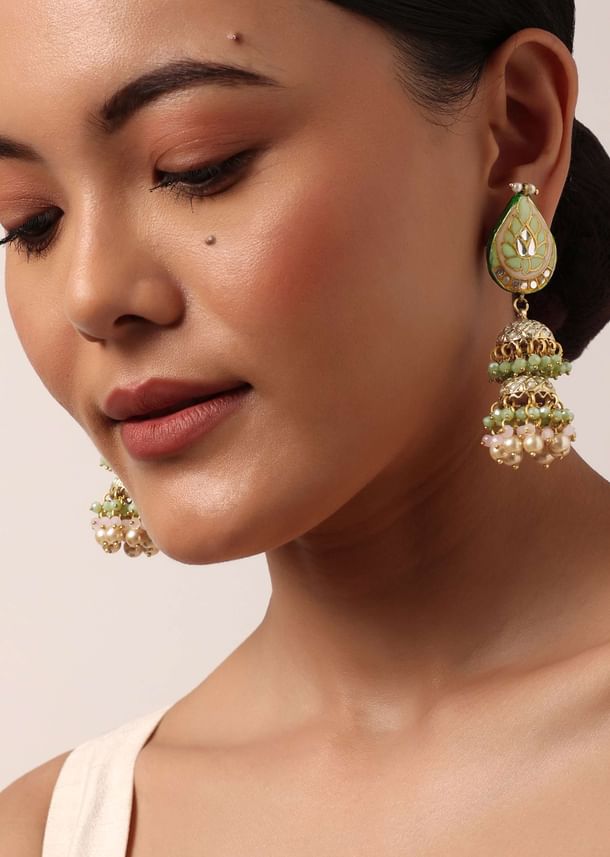 Green Oxidsed Earrings With Meenakari Detail And Floral Top