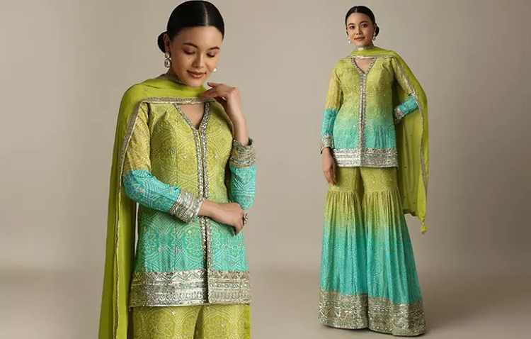 Light Orange Silk Bandhani Palazzo Suit With Embroidery