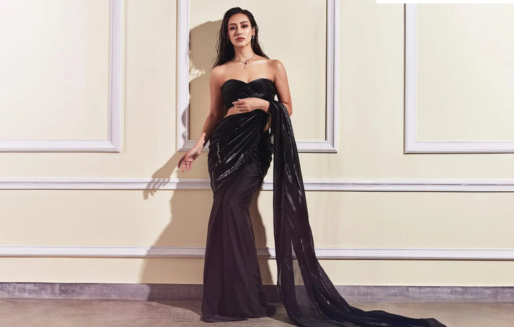 - Corset Blouse – A structured, bold choice that brings an edgy twist to party wear sarees in black.