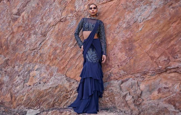 Elegant Blue Frill Saree With Embellished Ready Blouse