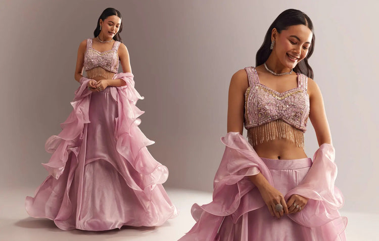Pink Ready Pleated Frill Saree With Heavy Bead Work Blouse