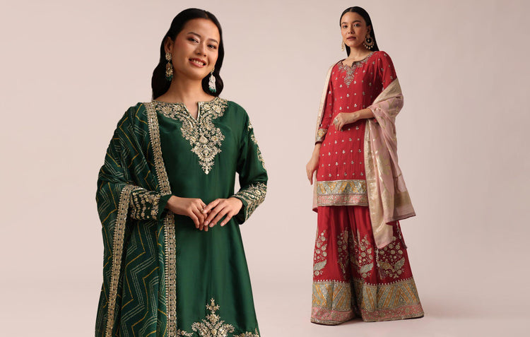 Women in Punjab begin their day with Karwa Chauth sargi. Make your sargi more memorable by gifting your daughter-in-law a heavy embroidered Punjabi silhouettes. KALKI doesn’t disappoint anyone. We have vibrant shades like hot pink, mustard, and red that are loved by Punjabi ladies. So, what are you waiting for? Look for the best Punjabi Karwa Chauth dress on our website and bring a smile to your daughter-in-law’s face.