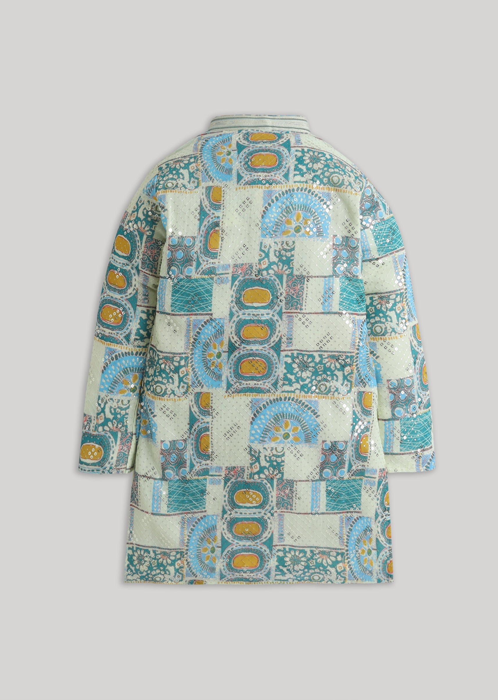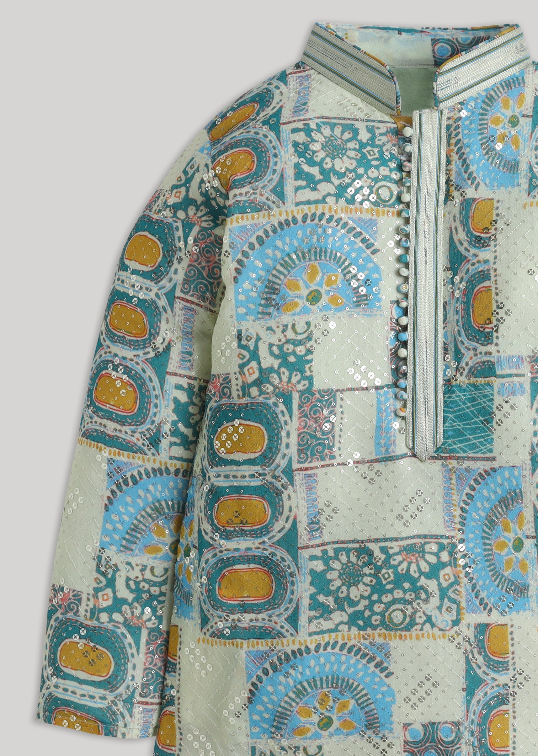 Soft pastel tones meet festive sparkle in this georgette kurta set with abstract detailing and sequin highlights. Designed with a mandarin collar and full sleeves, it comes paired with a matching bottom perfect for pre-wedding events and festive mornings.