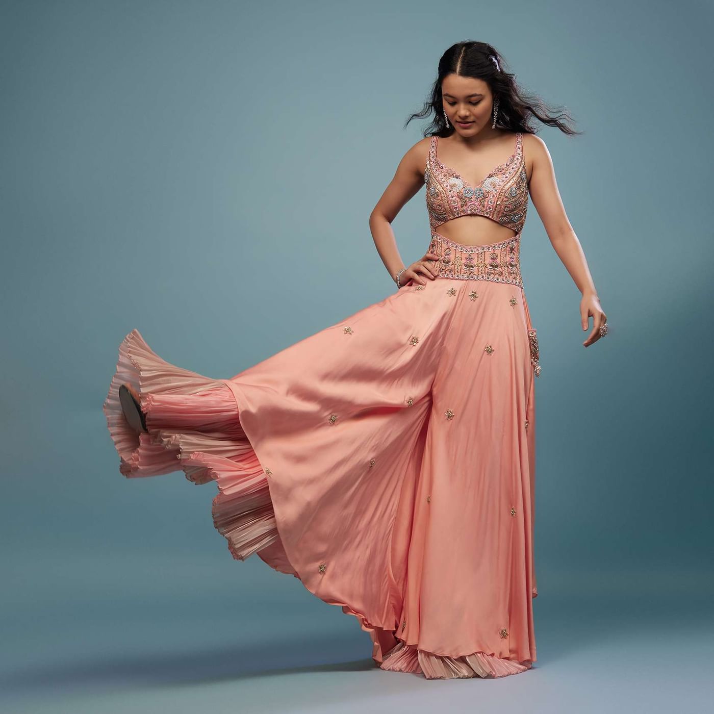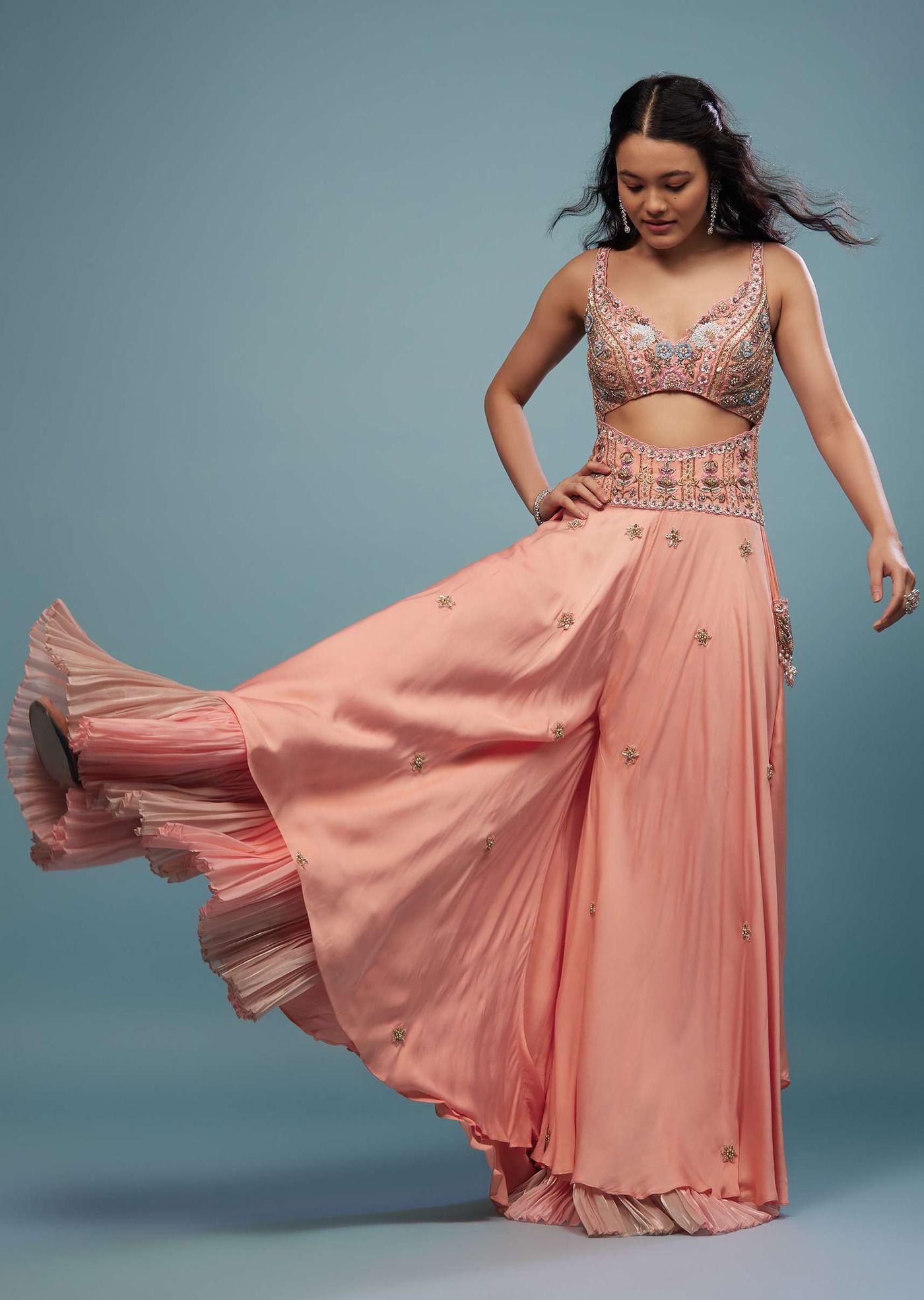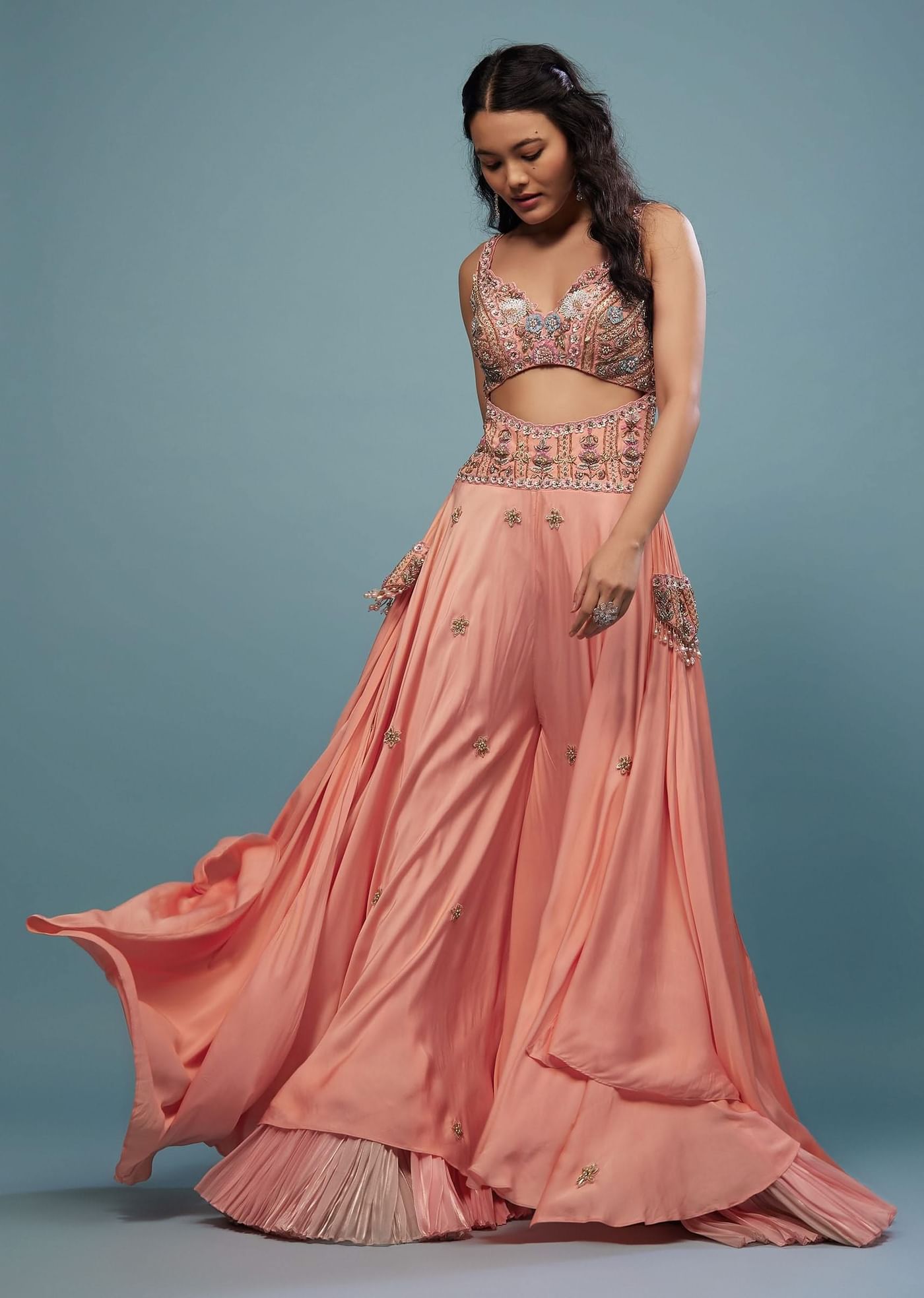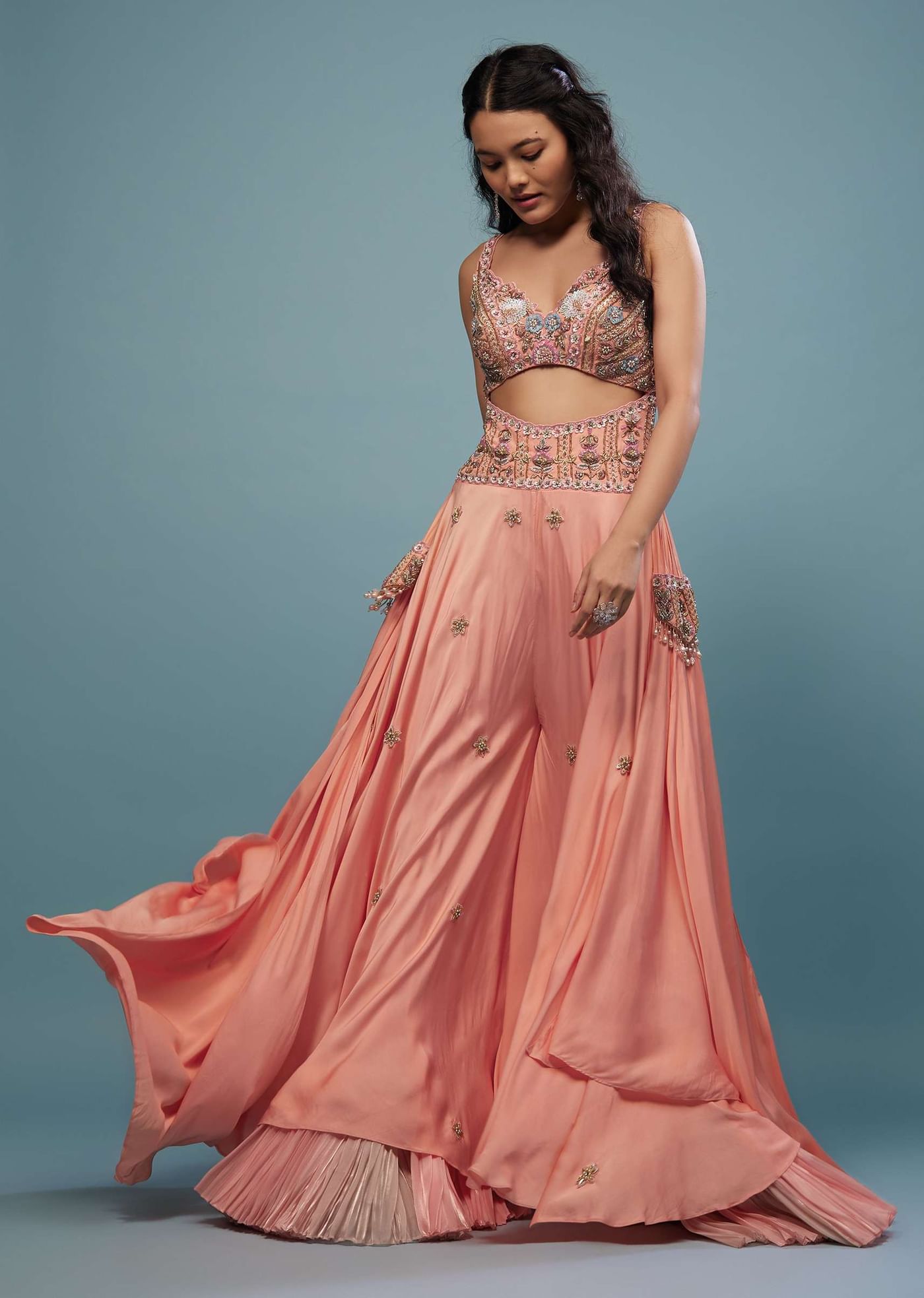 Amber peach jumpsuit embroidered in sequins, salli, pearls, and stones. The jumpsuit is fabricated in satin and has a heavily embroidered bodice. The jumpsuit comes in a strappy sweetheart neckline,... More Product Details