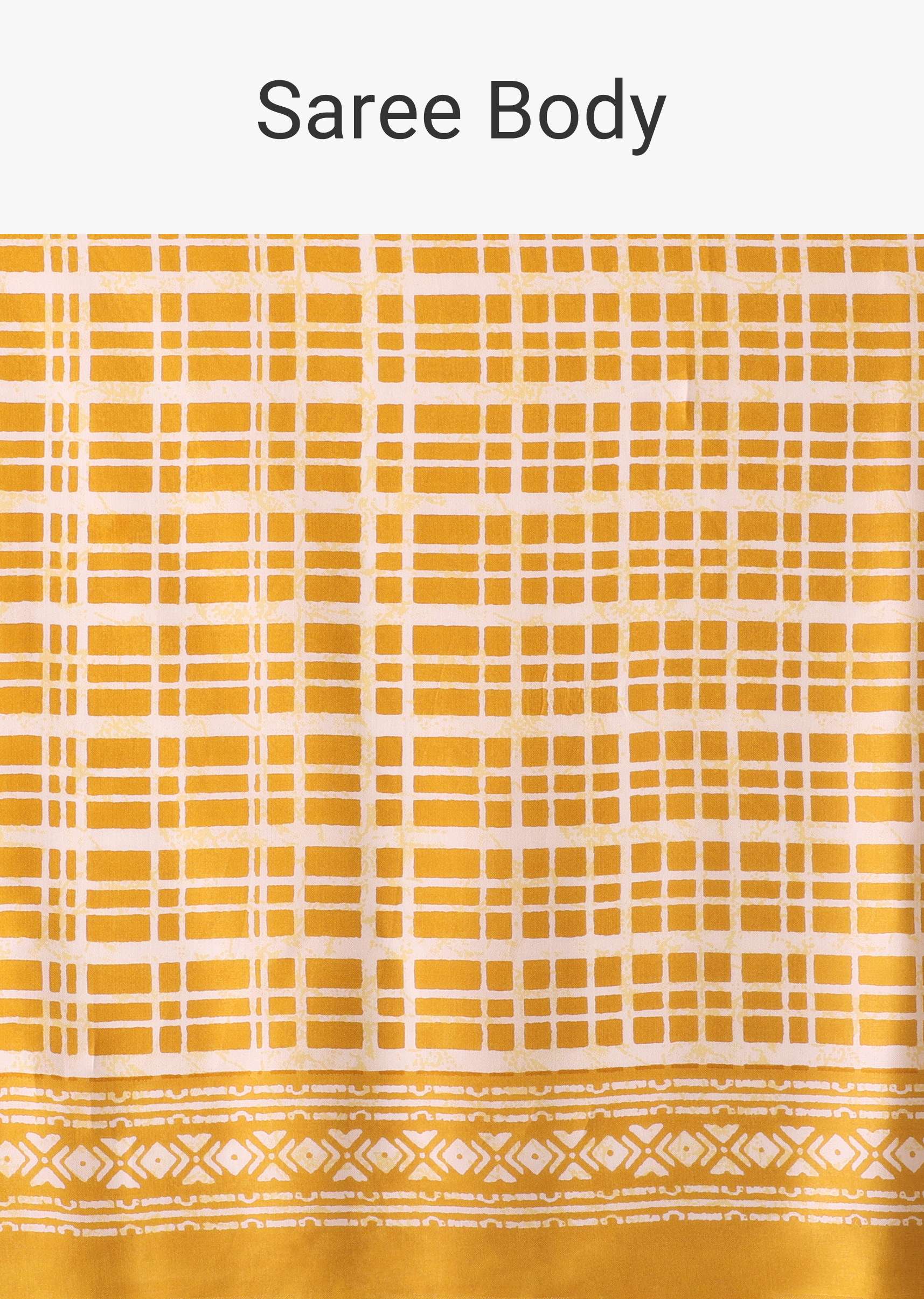 A beautiful amber-yellow printed saree in crepe. The saree is fabricated in crepe with floral batic print all over with a nice printed pallu. It has tassels on the edges... More Product Details