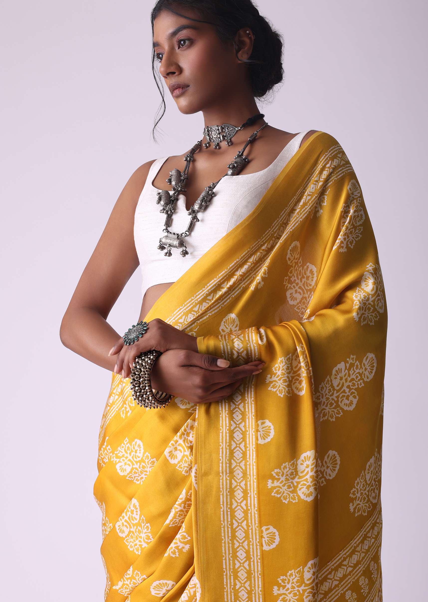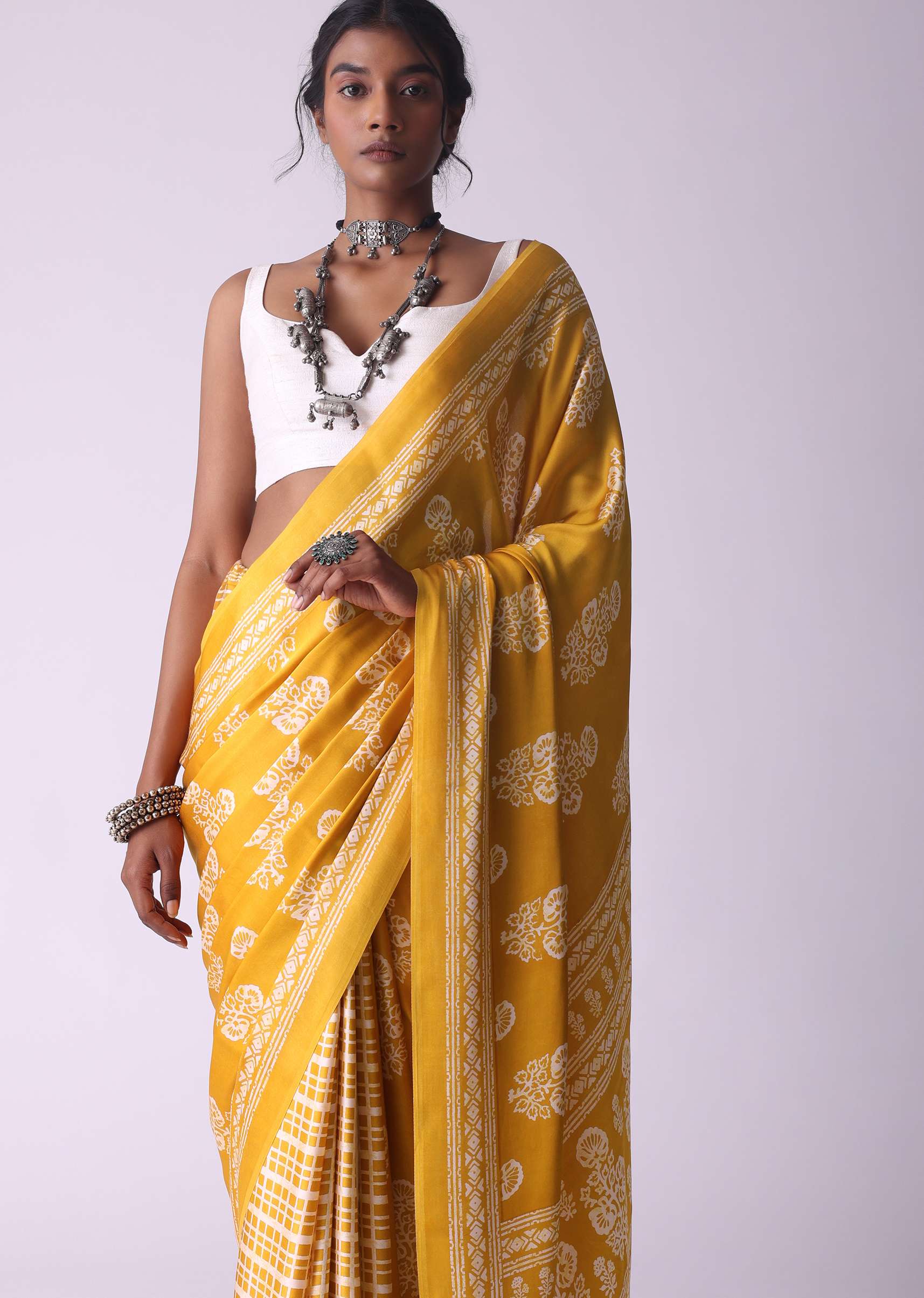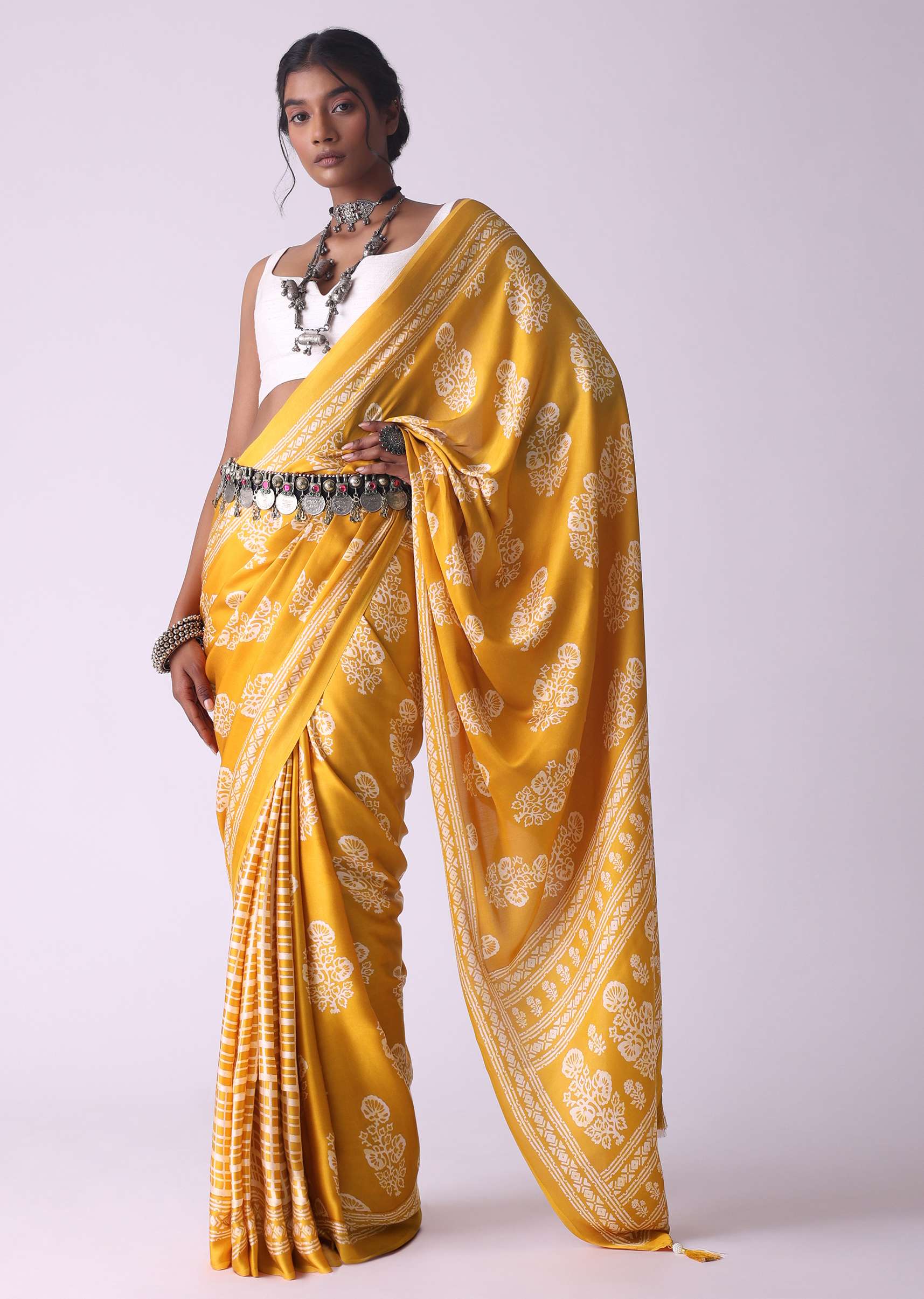 A beautiful amber-yellow printed saree in crepe. The saree is fabricated in crepe with floral batic print all over with a nice printed pallu. It has tassels on the edges of the pallu. It comes with a matching unstitched blouse. NOTE - The blouse worn by the model is designed by our team for styling purposes. You can get your hands on designer blouses by clicking on the blouse link. You can also get matching shapewear as our stylists suggested for the perfect look. Awarded As The Most Trusted Brand We'Re Delivering Styles You Love Just As Promised.