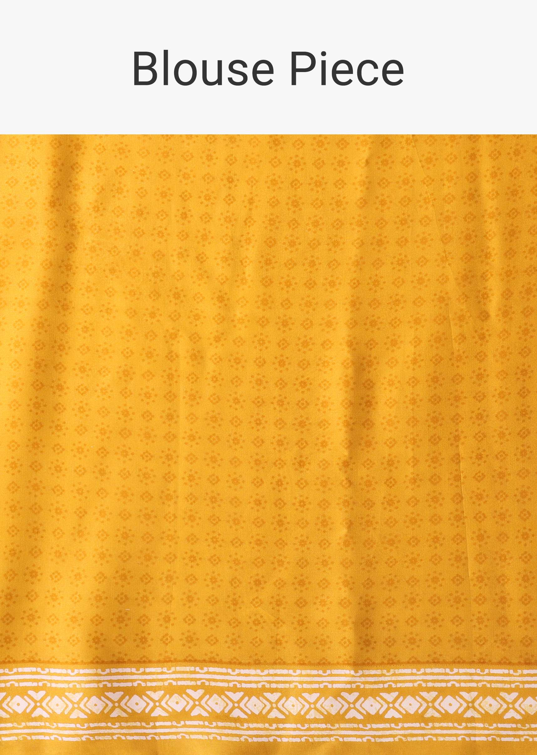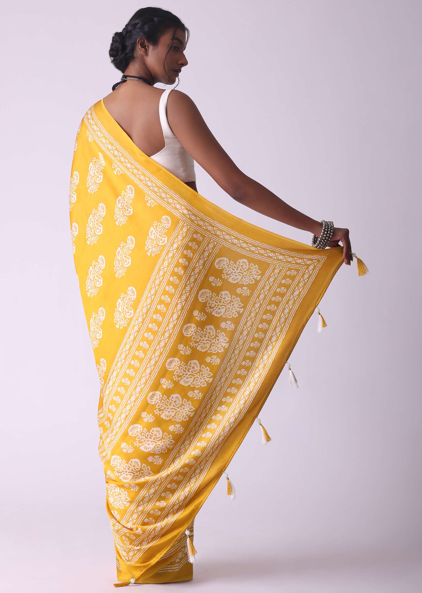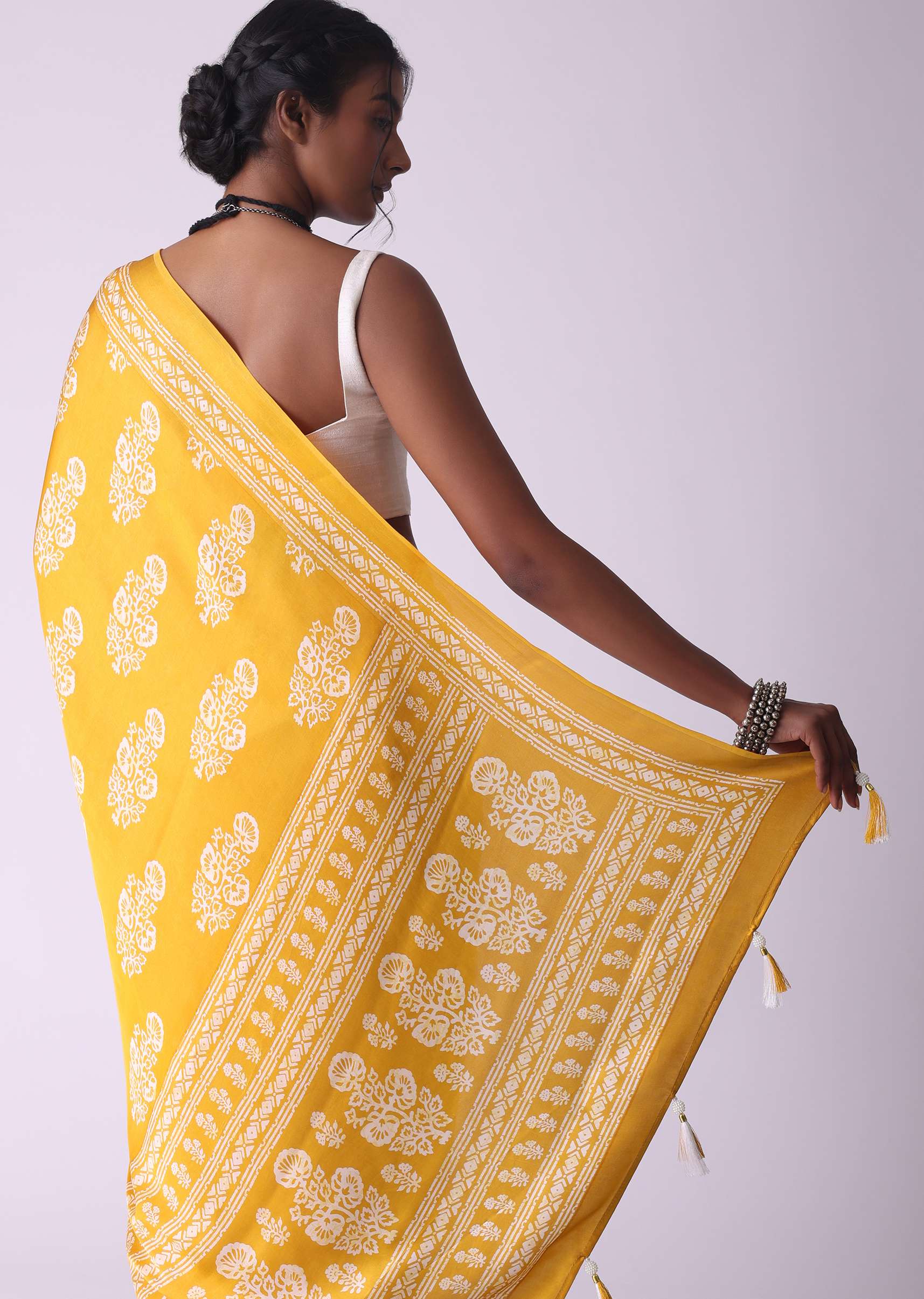 A beautiful amber-yellow printed saree in crepe. The saree is fabricated in crepe with floral batic print all over with a nice printed pallu. It has tassels on the edges of the pallu. It comes with a matching unstitched blouse. NOTE - The blouse worn by the model is designed by our team for styling purposes. You can get your hands on designer blouses by clicking on the blouse link. You can also get matching shapewear as our stylists suggested for the perfect look. Awarded As The Most Trusted Brand We'Re Delivering Styles You Love Just As Promised.