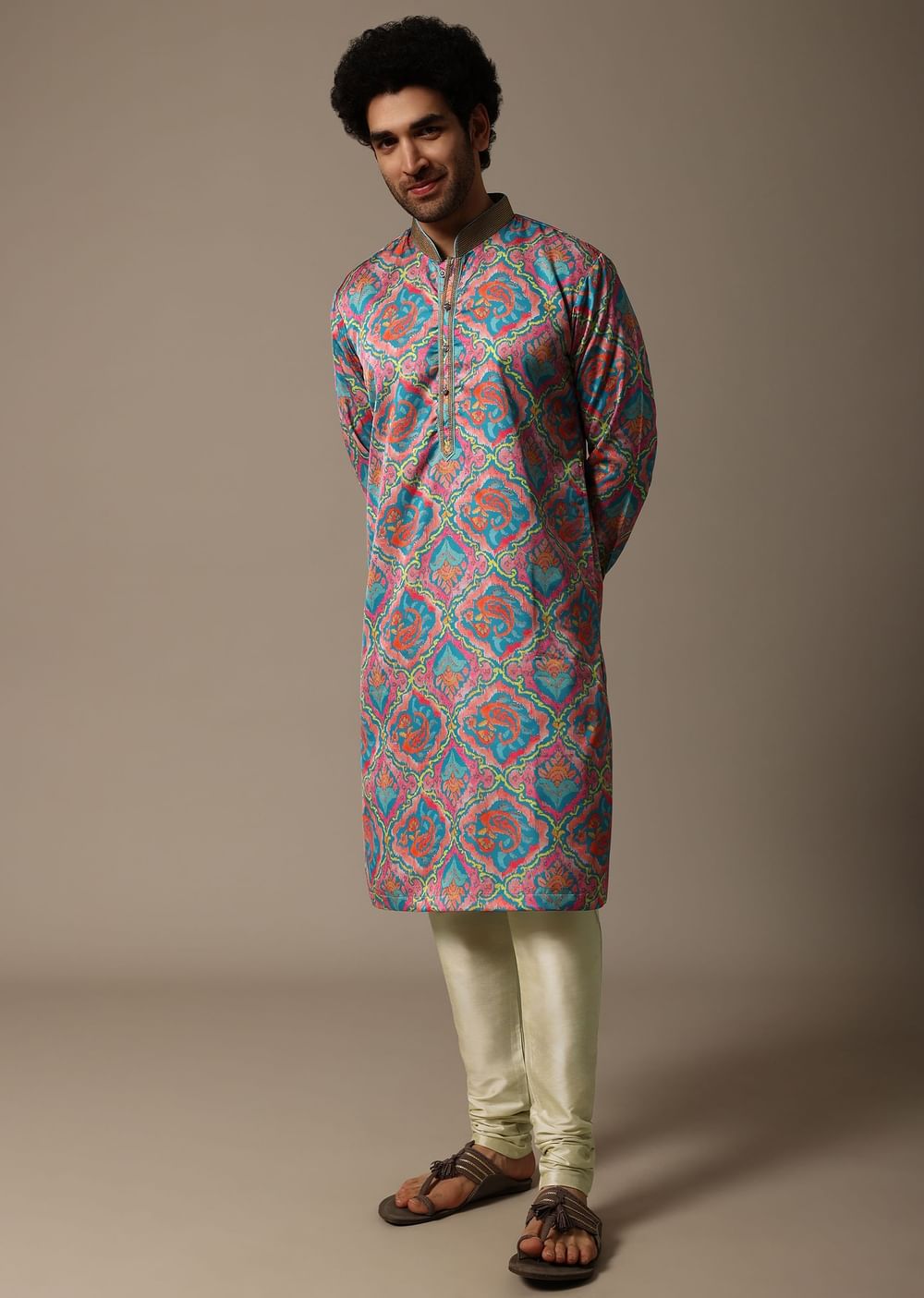 Aqua Blue Printed Silk Kurta Set For Men