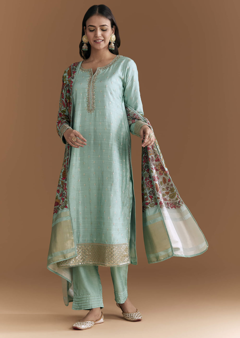 Craft and colour take the lead as this aqua blue silk embroidered kurta set features fine zardosi on the kurta and a kalamkari floral dupatta for contrast. The trio reads... More Product Details