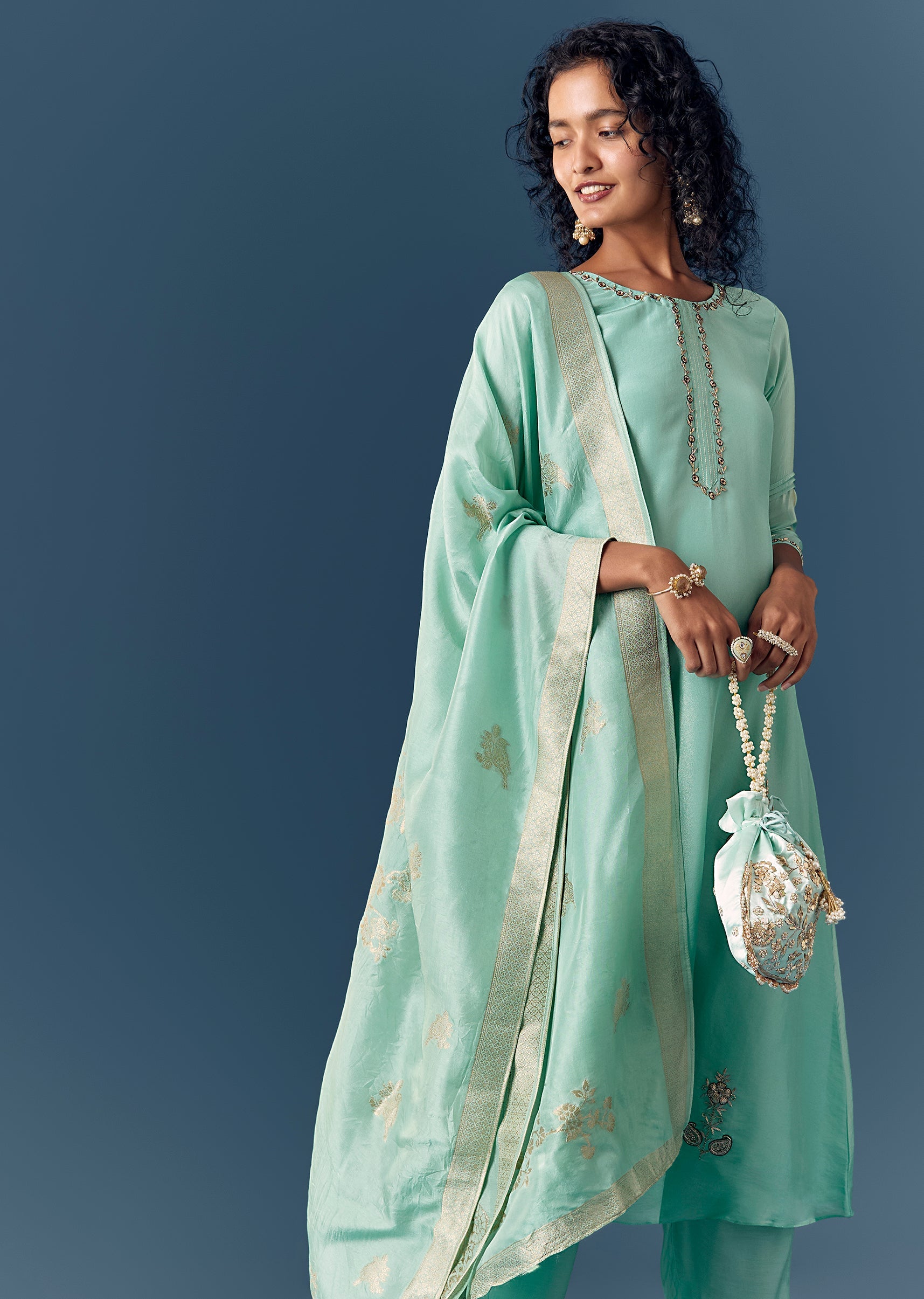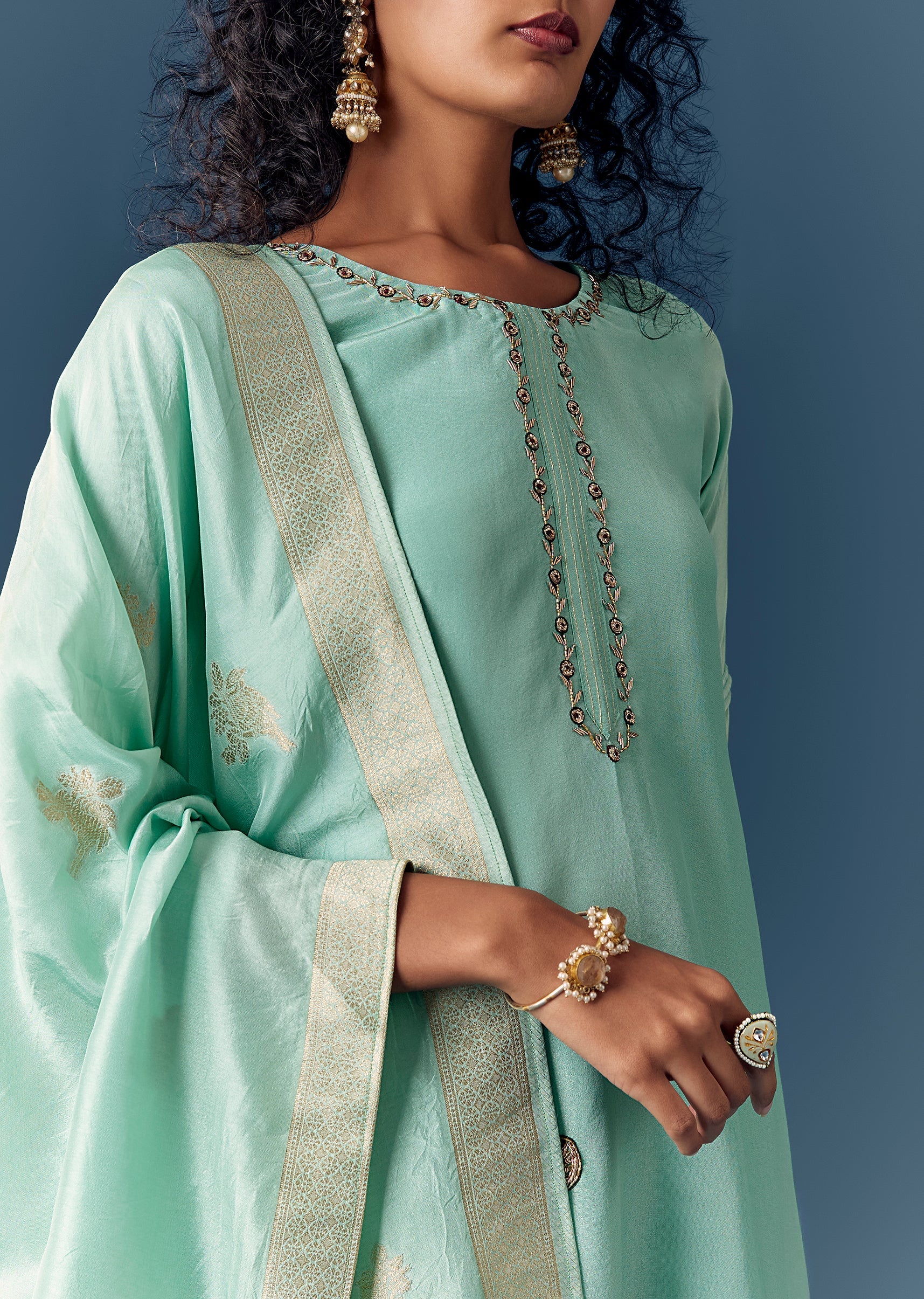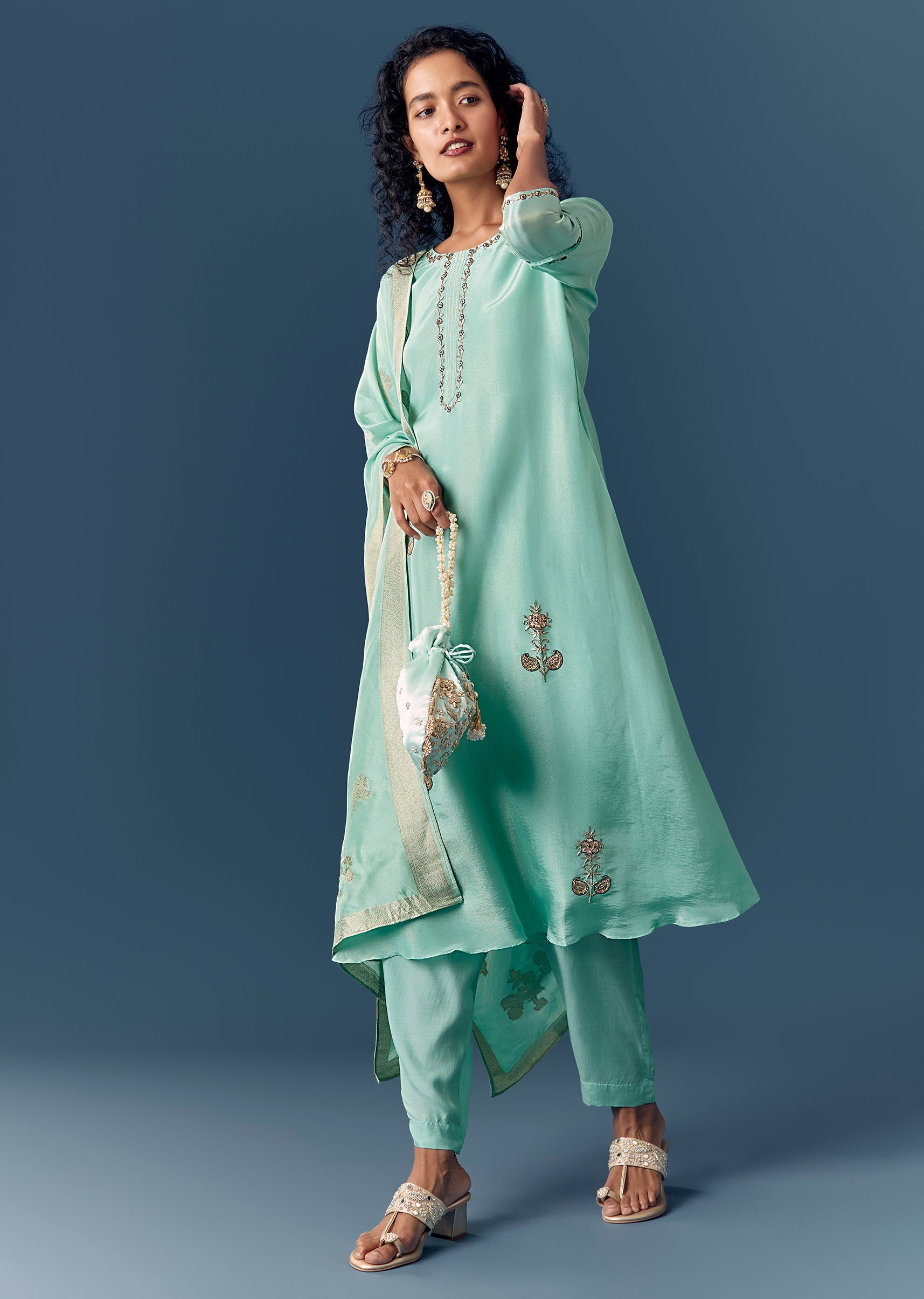 Add delicate gold jewelry and classic juttis for a graceful look.