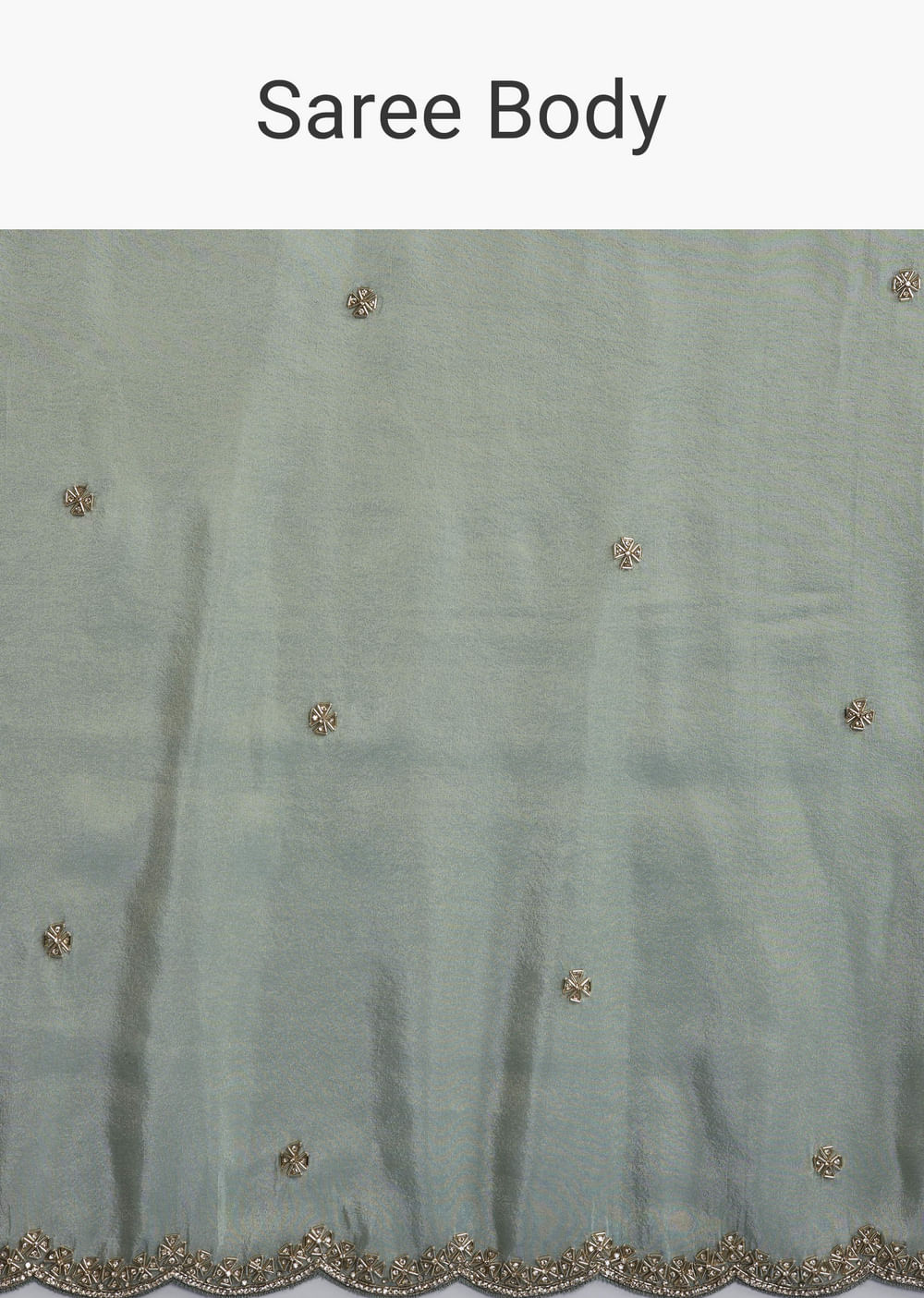With a cool aqua tone that brightens the face, this tissue saree balances small buttis with a scalloped border worked in salli, cutdana and stones. The embroidery reads detailed up... More Product Details