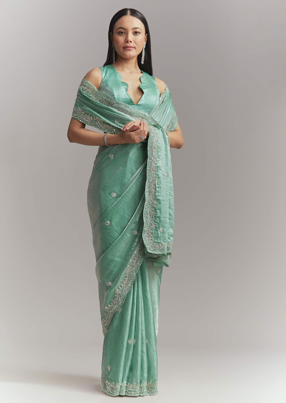 Fresh tones bring lightness, and this aqua green chinon embroidered saree reflects that easy charm. Velvet-touch fabric is enhanced with floral buttis in cutdana, sequins, beads and stones, detailed with a scallop border. This saree makes the wearer look radiant and graceful for receptions or festive evenings. Awarded as the Most Trusted Brand, we're delivering styles you love, just as promised.