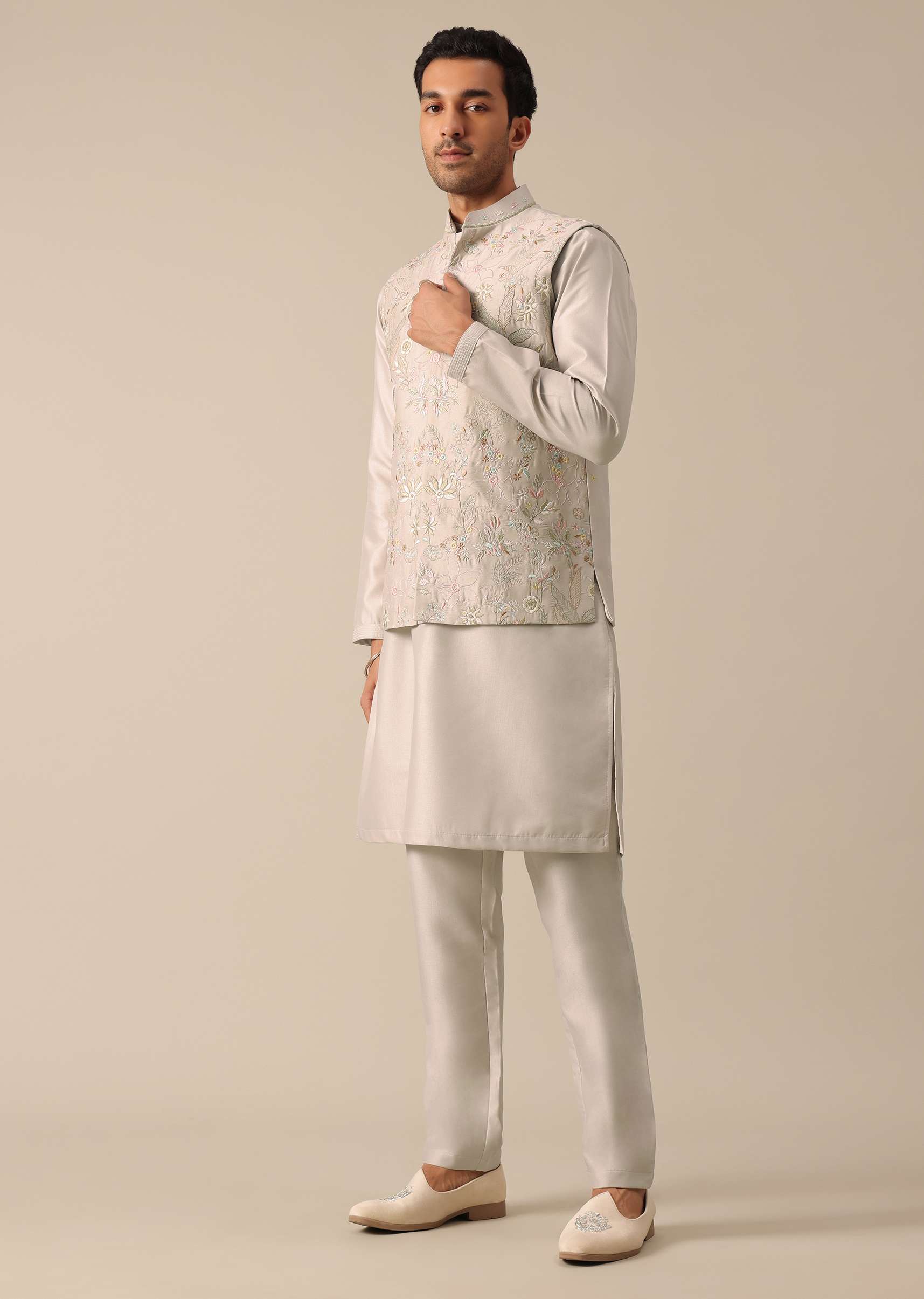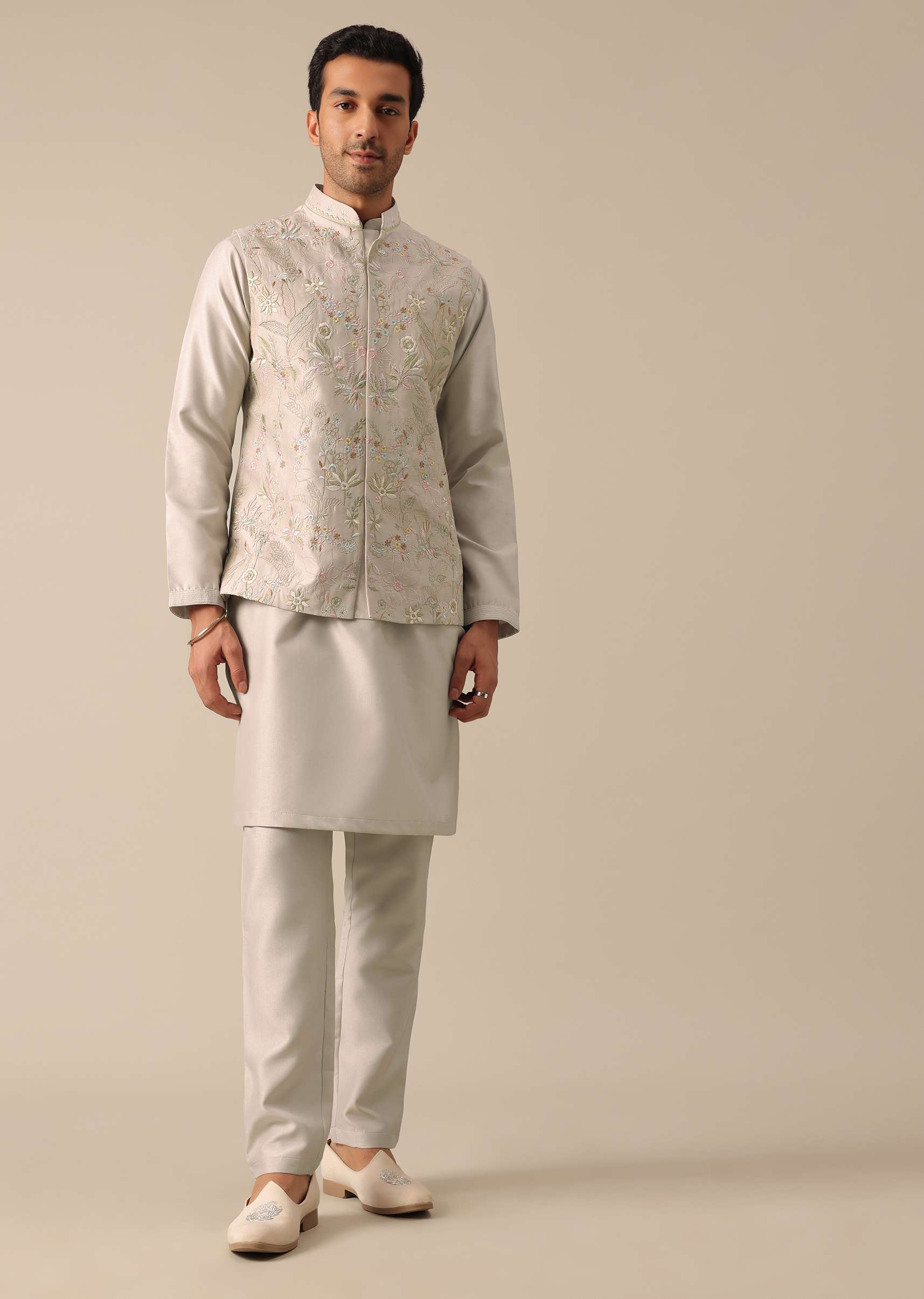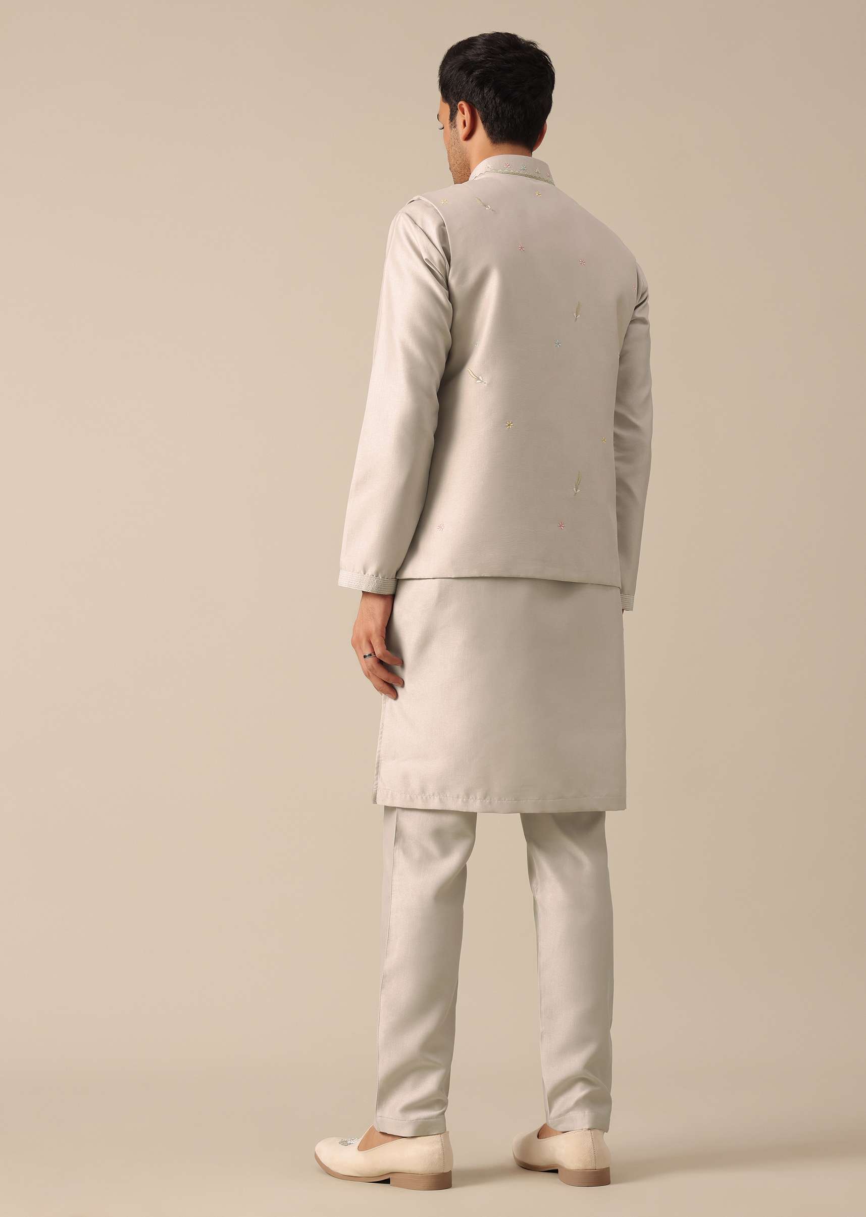 Ash Grey Jacket And Kurta Set With Floral Motifs