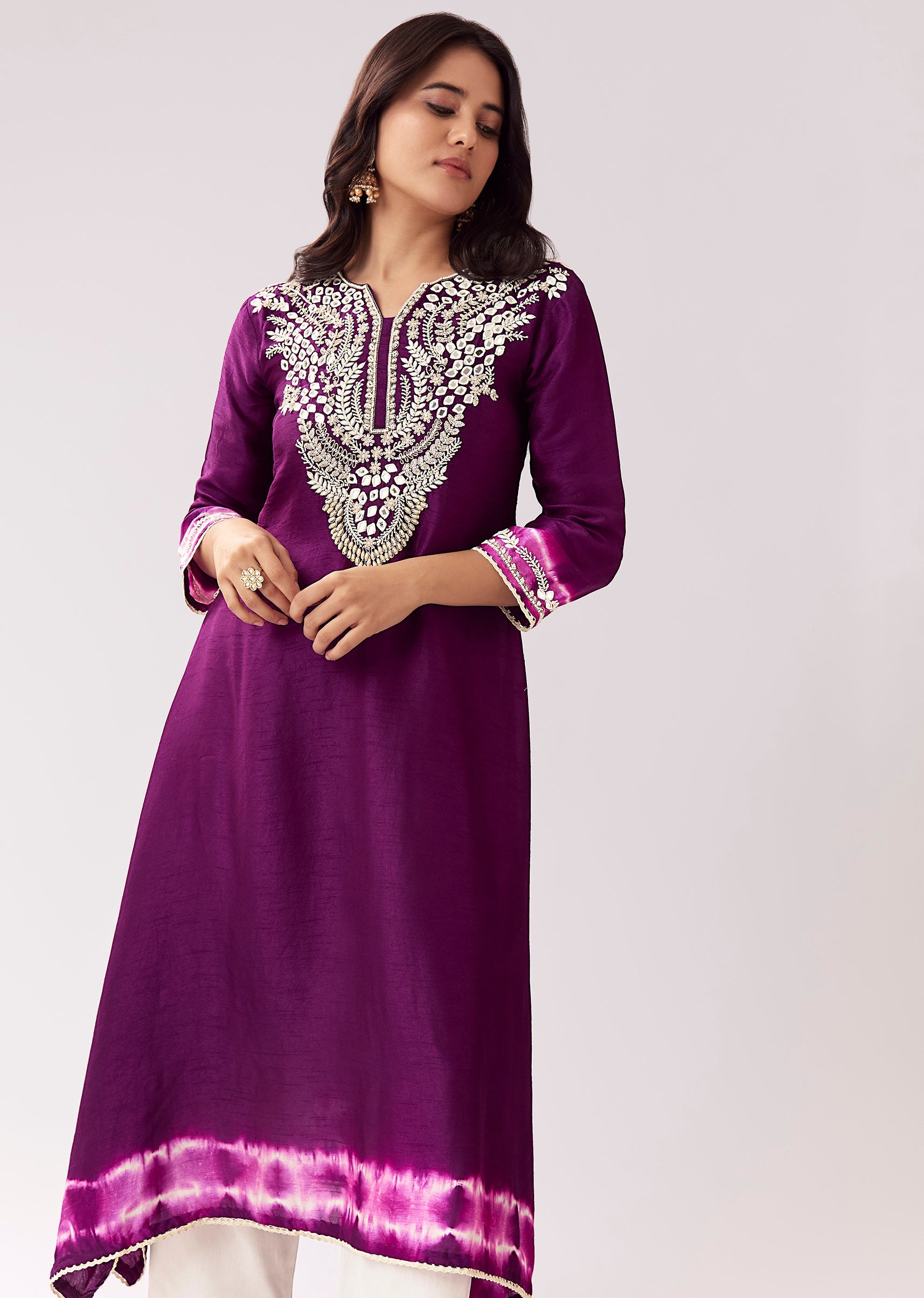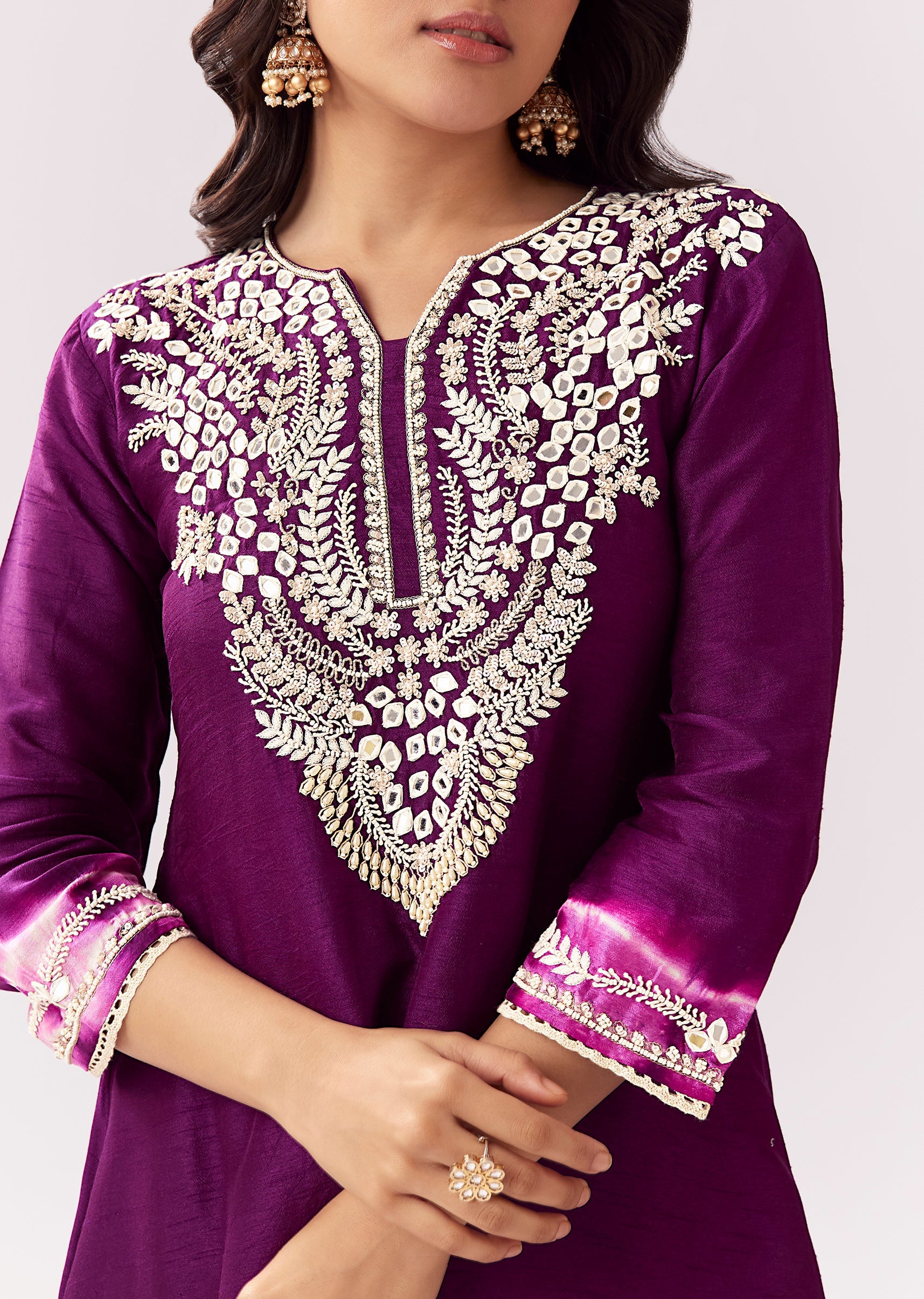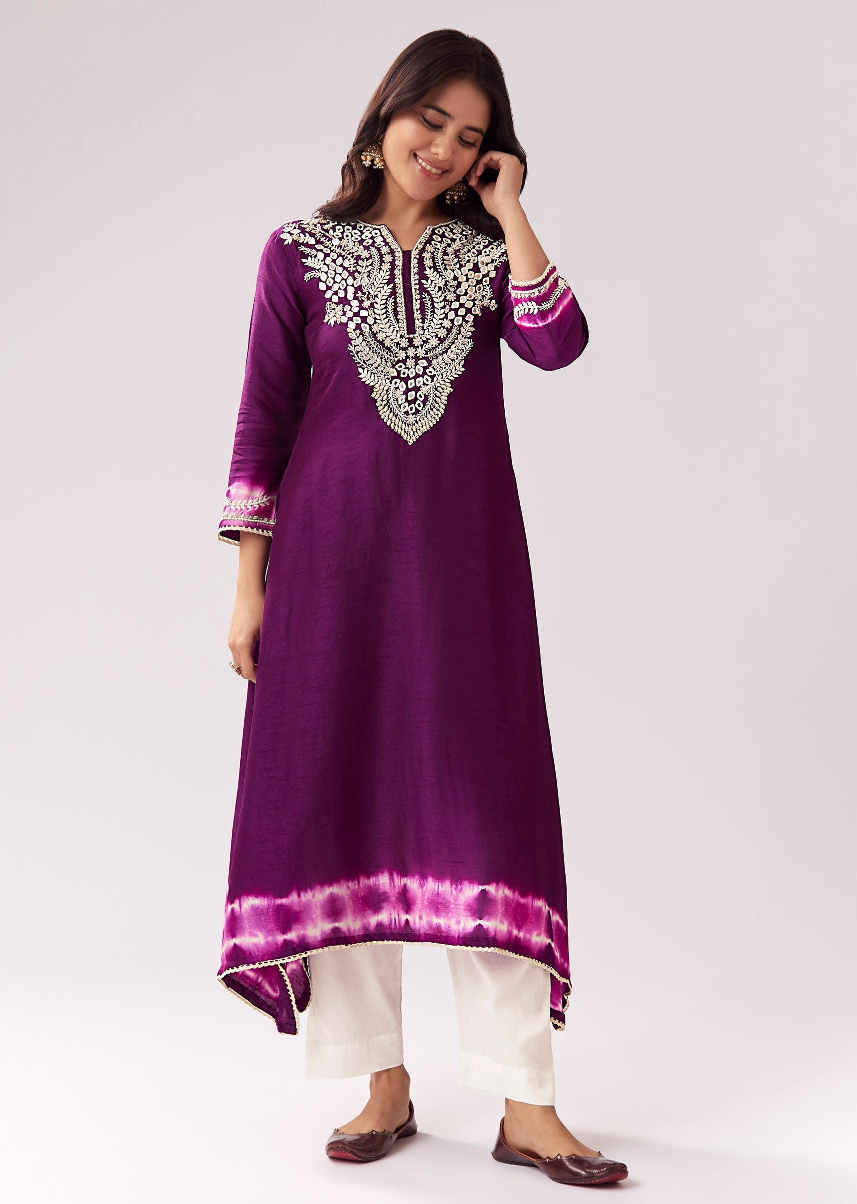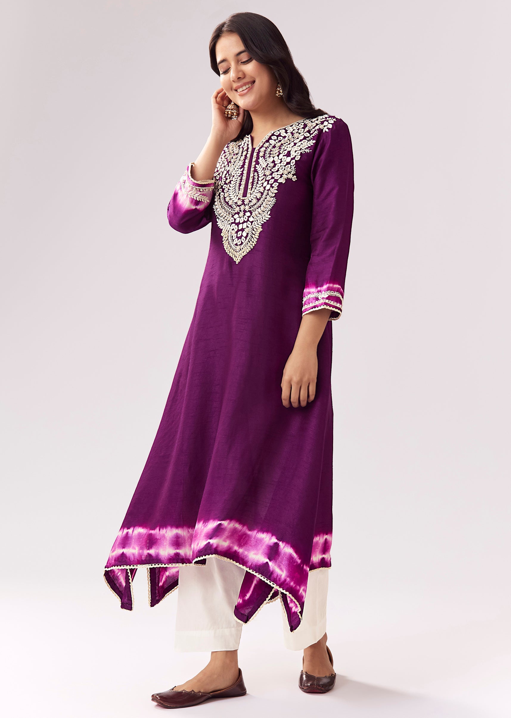 Asymmetric Purple Kurti Coord With Mirror Work And Leheriya Border