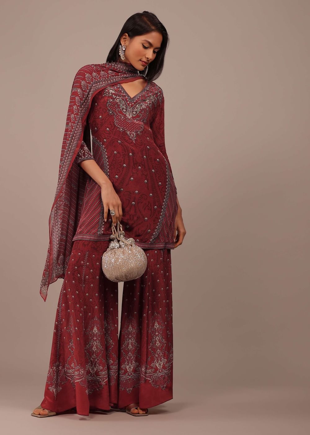 A stunning aurora red printed sharara suit in crepe. The top is printed with stonework in a V neckline and has three-forth sleeves. Paired with a gorgeous printed dupatta with... More Product Details