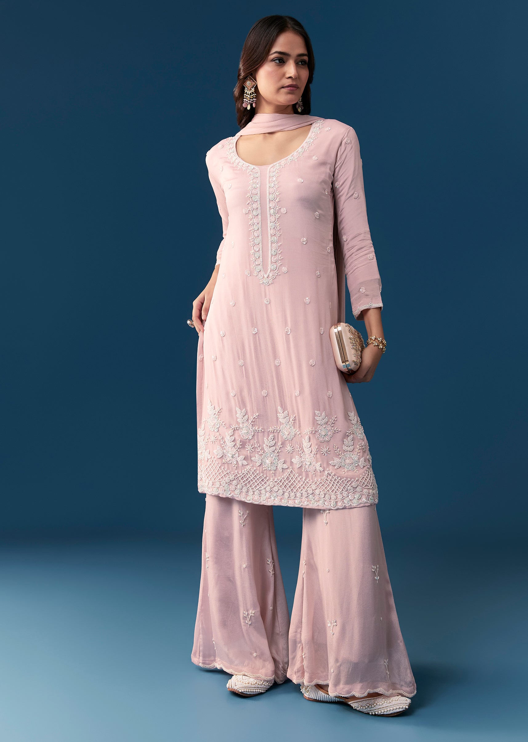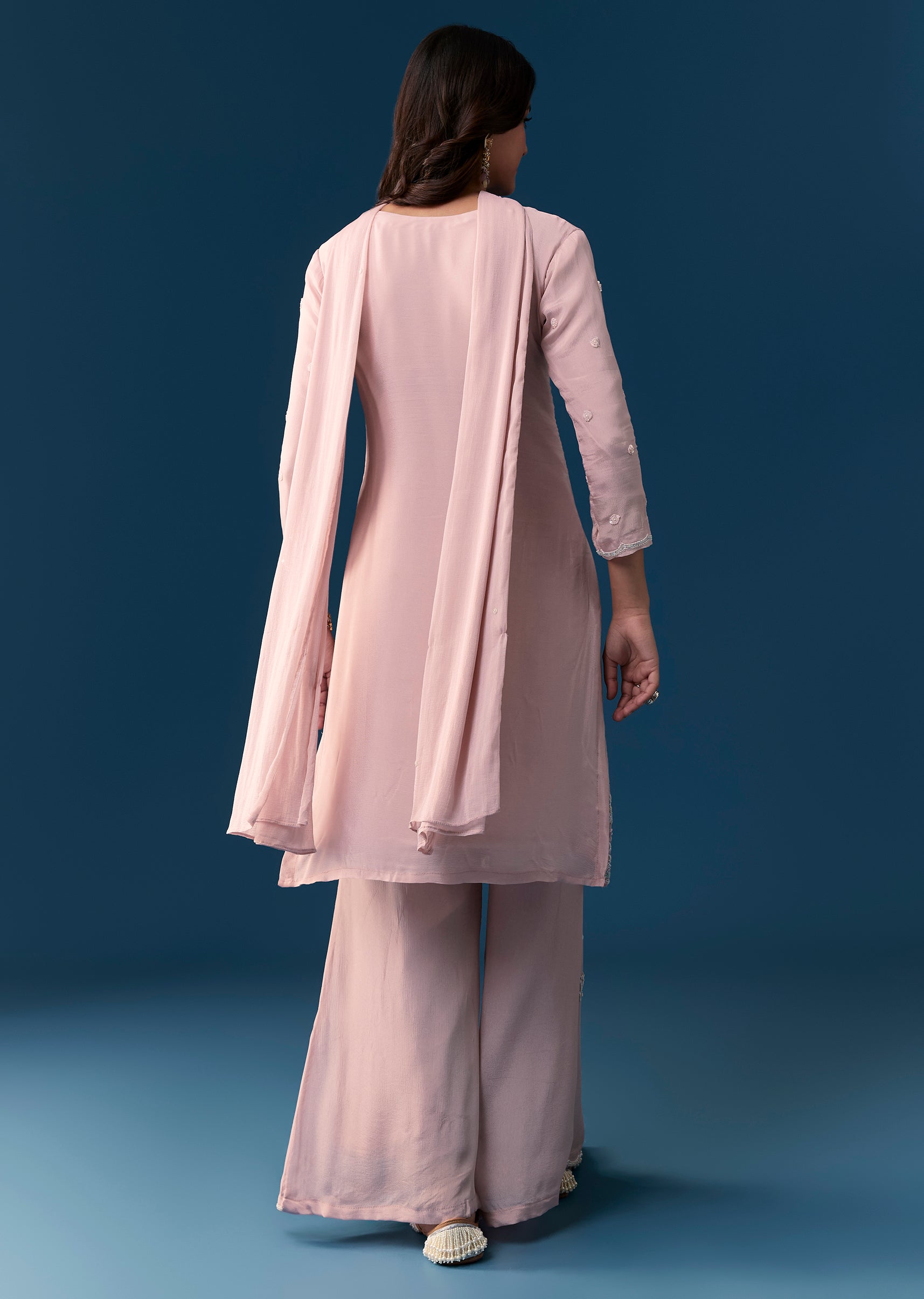 Baby Pink Chinon Kurta Set With Cut Dana Moti And Sequins Work