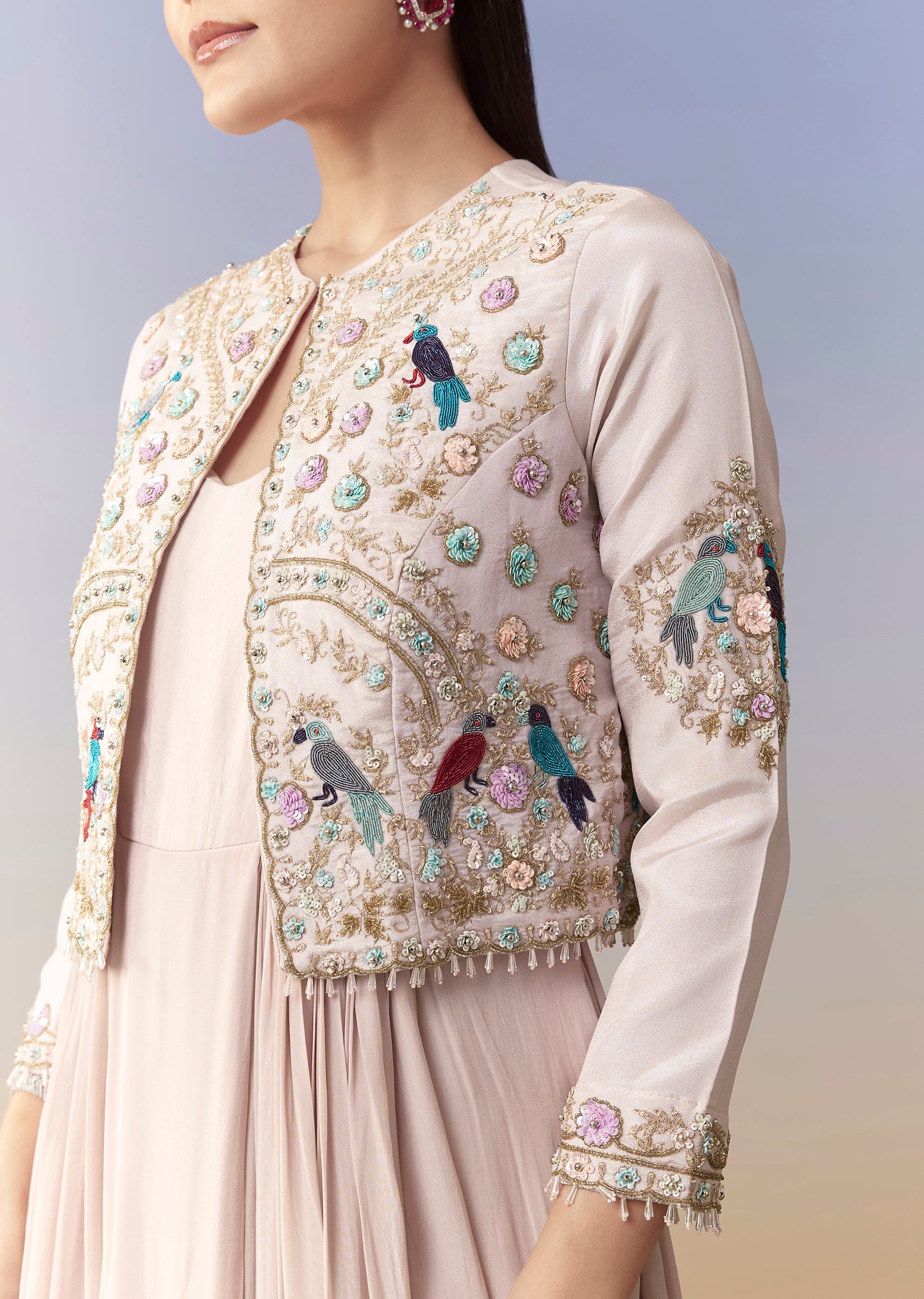 Step into graceful sophistication with this baby pink cowl style gown set, paired with a beautifully embellished jacket featuring delicate sequin and zari work. The soft drape of the gown... More Product Details