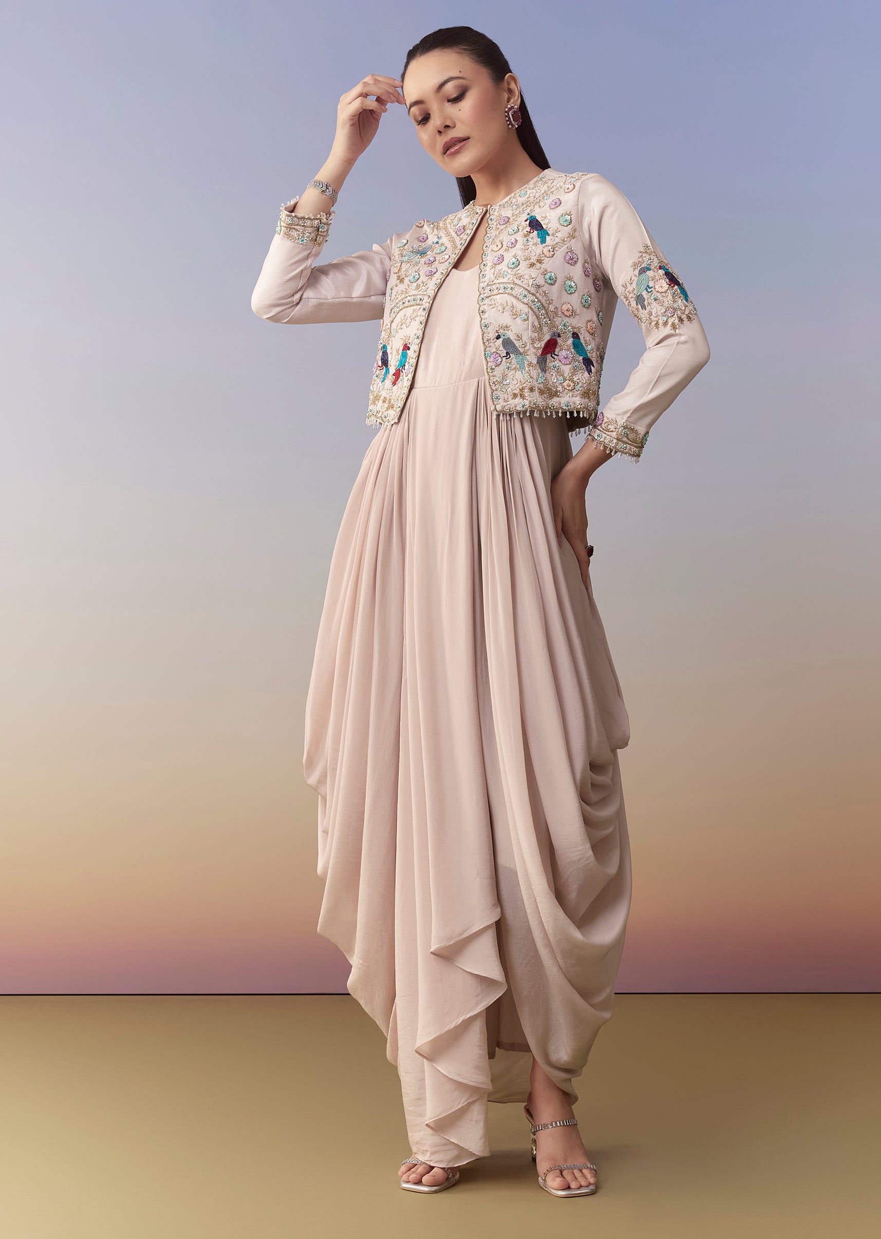 Step into graceful sophistication with this baby pink cowl style gown set, paired with a beautifully embellished jacket featuring delicate sequin and zari work. The soft drape of the gown creates an elegant, fluid silhouette, while the ornate jacket adds festive richness and structure. Perfect for receptions, sangeet events, or special celebrations, this ensemble blends contemporary styling with classic embroidery for a refined, standout look. Awarded as the Most Trusted Brand, we're delivering styles you love, just as promised.