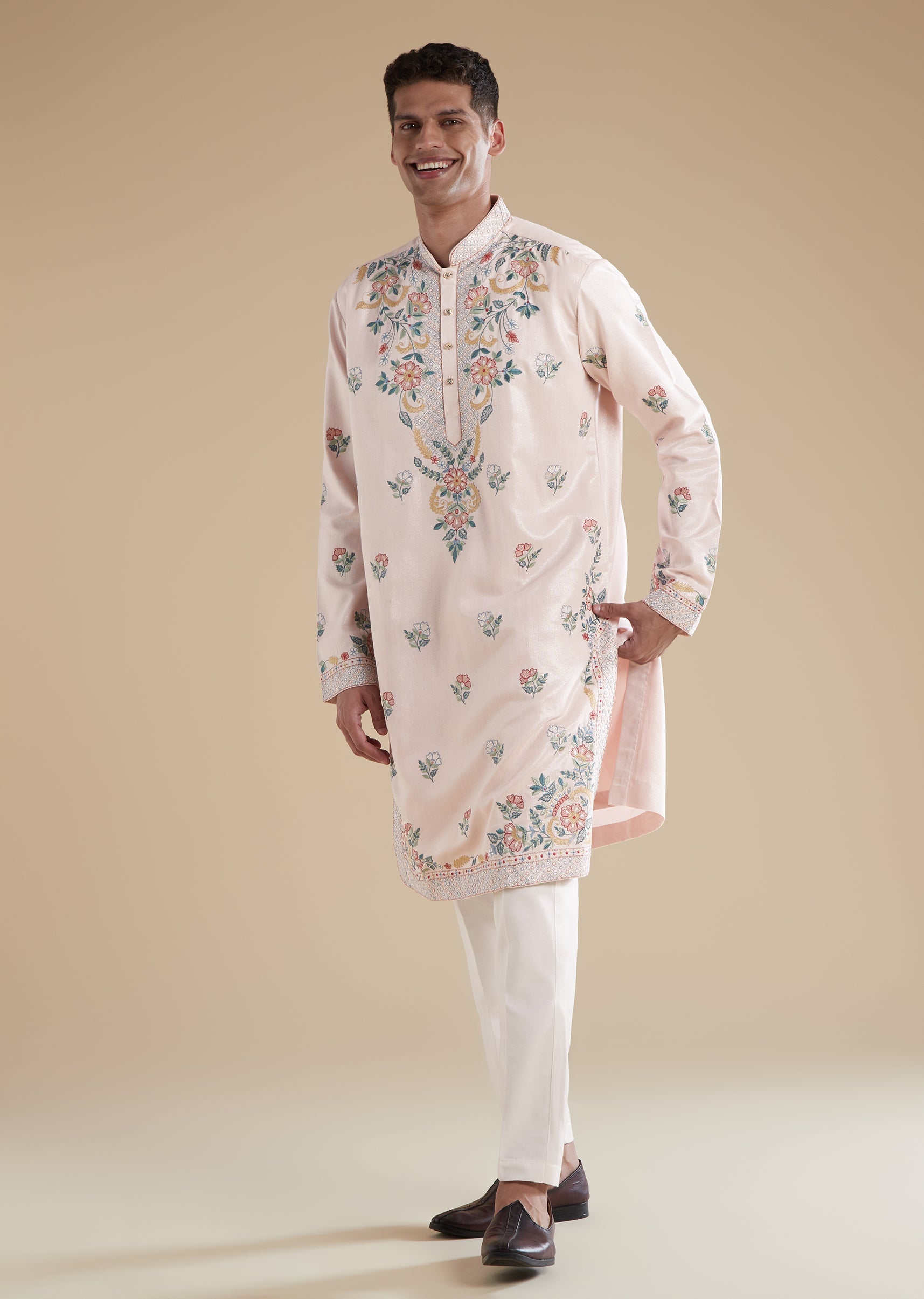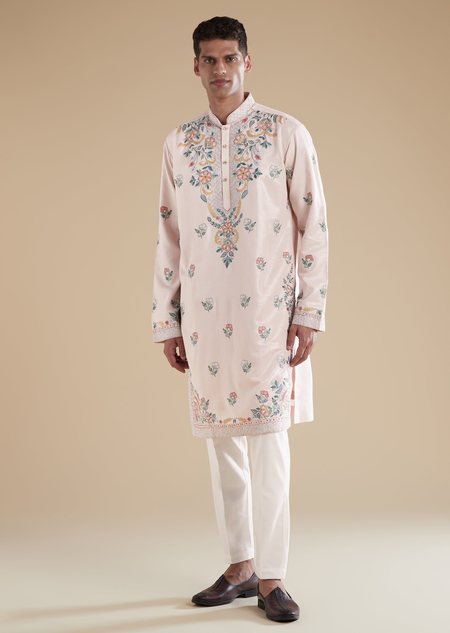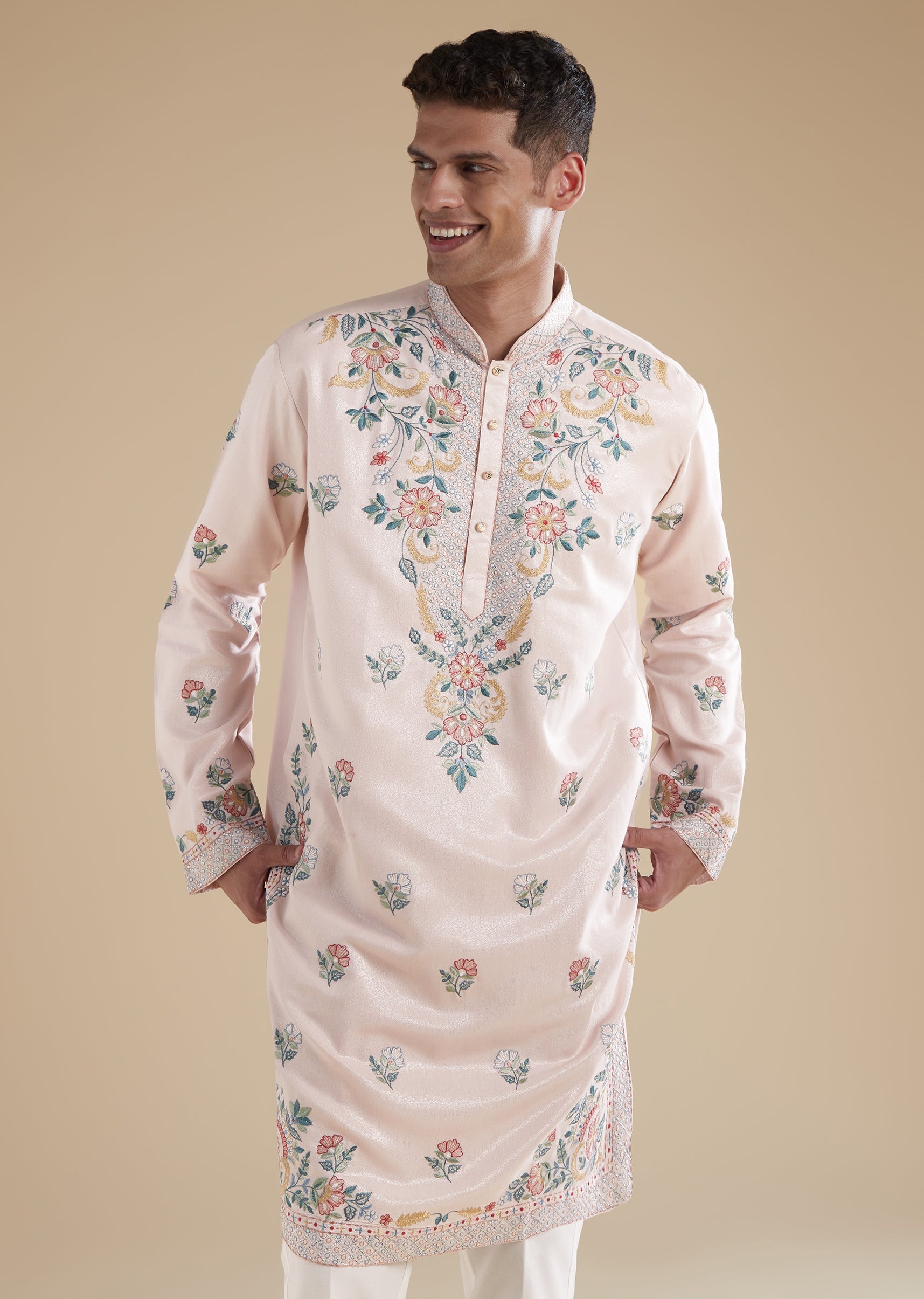 Baby Pink Modal Mens Kurta Set with Thread Resham Detail Work