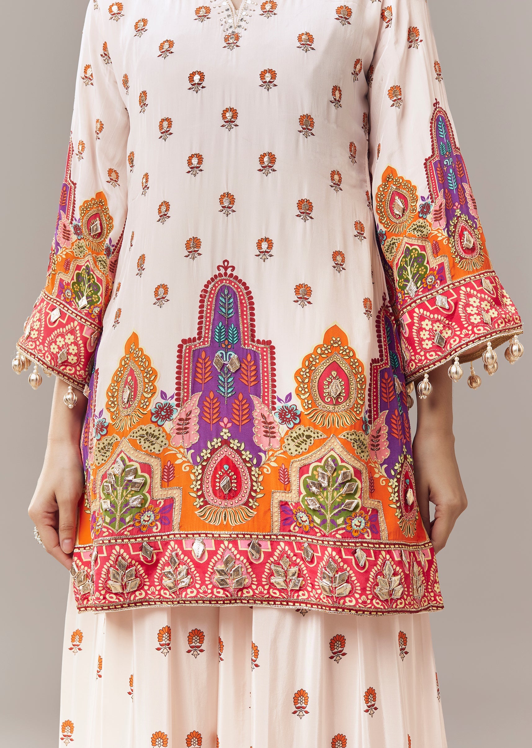 Delicate and festive, this baby pink sharara suit is perfect for Mehendi and wedding celebrations. Crafted in soft crepe fabric, the kurta features intricate indie prints enhanced with mirror and... More Product Details