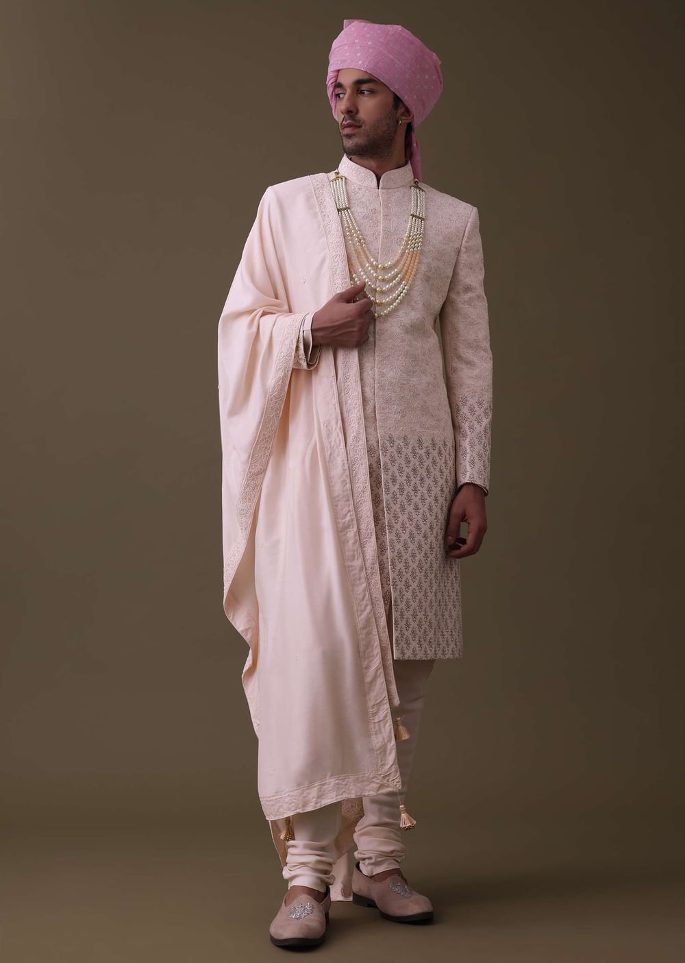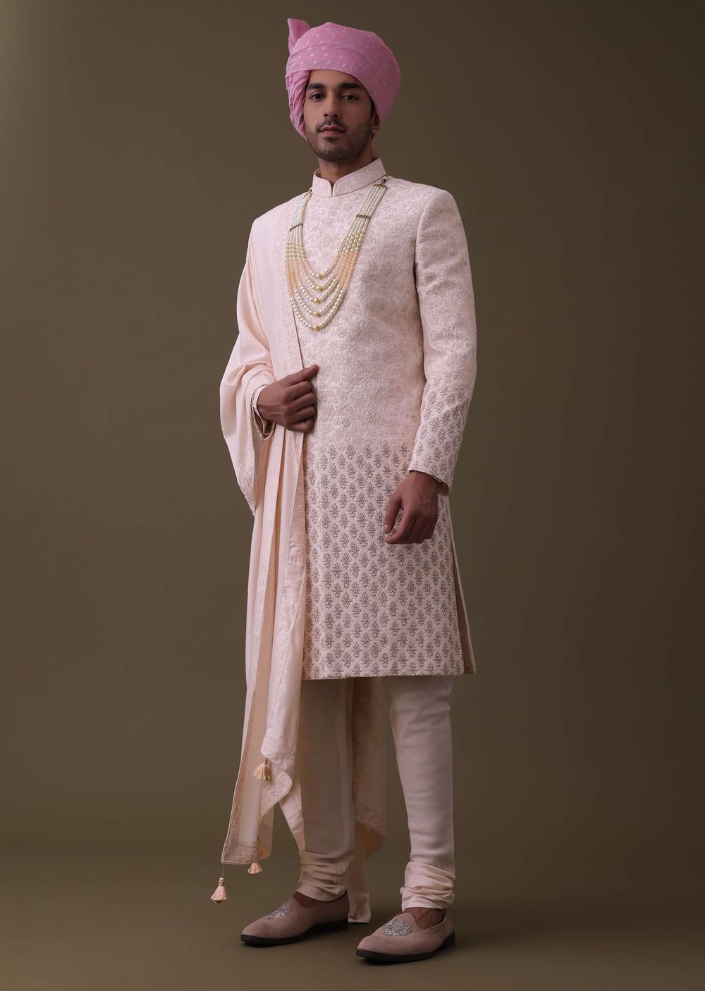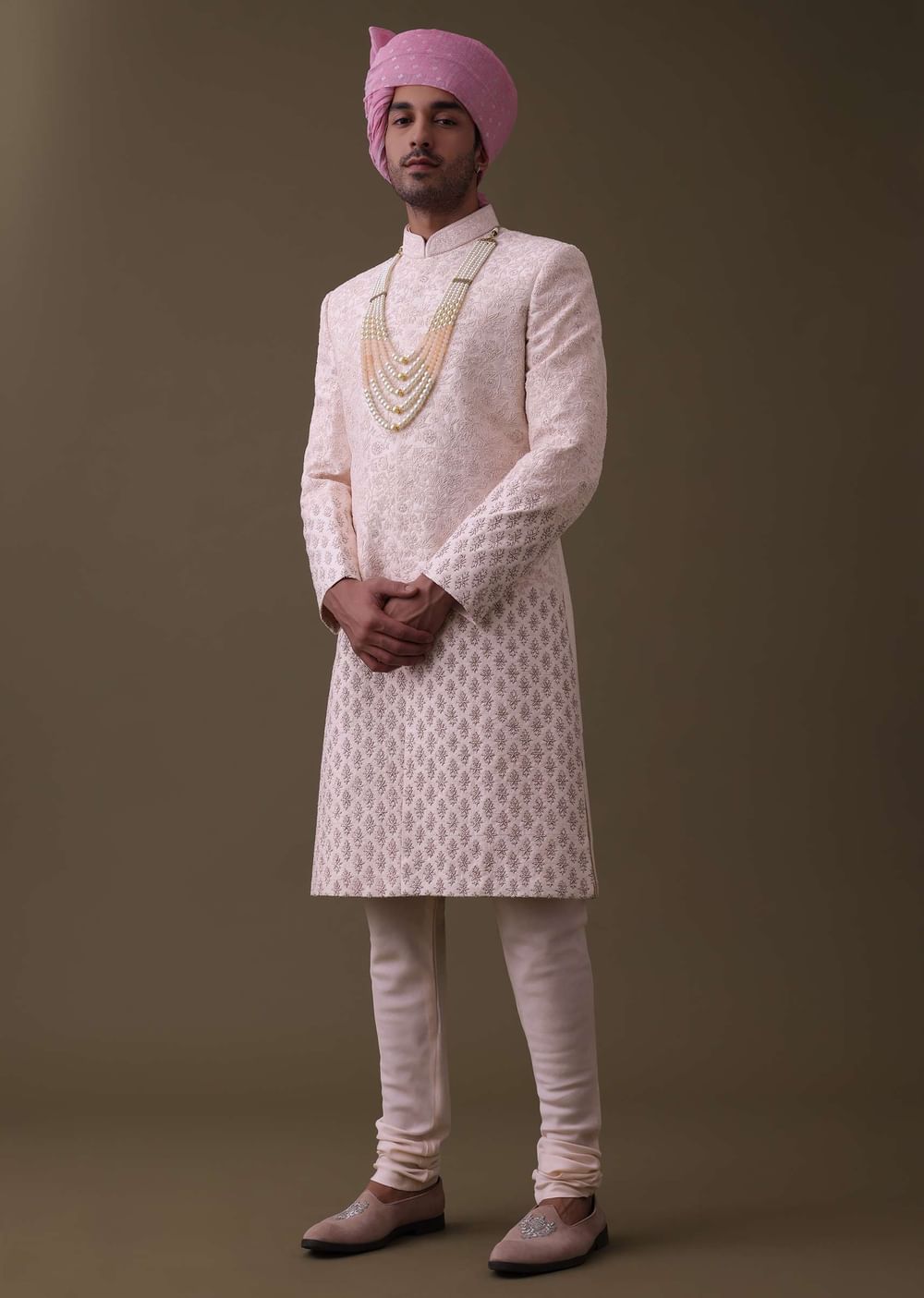 Baby Pink Sherwani Set In Raw Silk With Thread Work And Moti Embroidery
