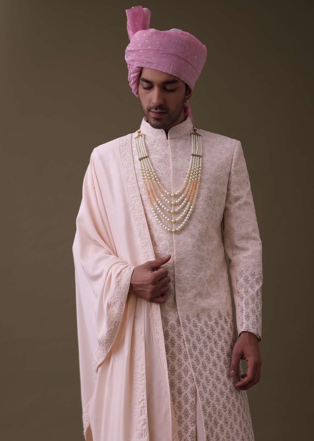 Step into sophistication with our baby pink sherwani set. The delicate threadwork and moti embroidery create a stunning contrast that exudes classiness. The sherwani features a mandarin collar neckline with full sleeves.The set comes with a matching mala and dupatta to complete the look.EVENT - Perfect for weddings and receptions. NOTE - Buttons and accessories may vary in color, shape, and size.Change folds regularly. Awarded as the Most Trusted Brand, we're delivering styles you love, just as promised.