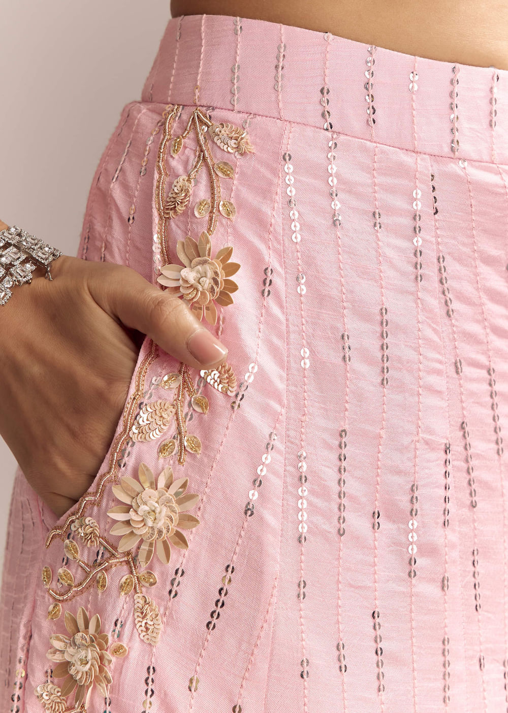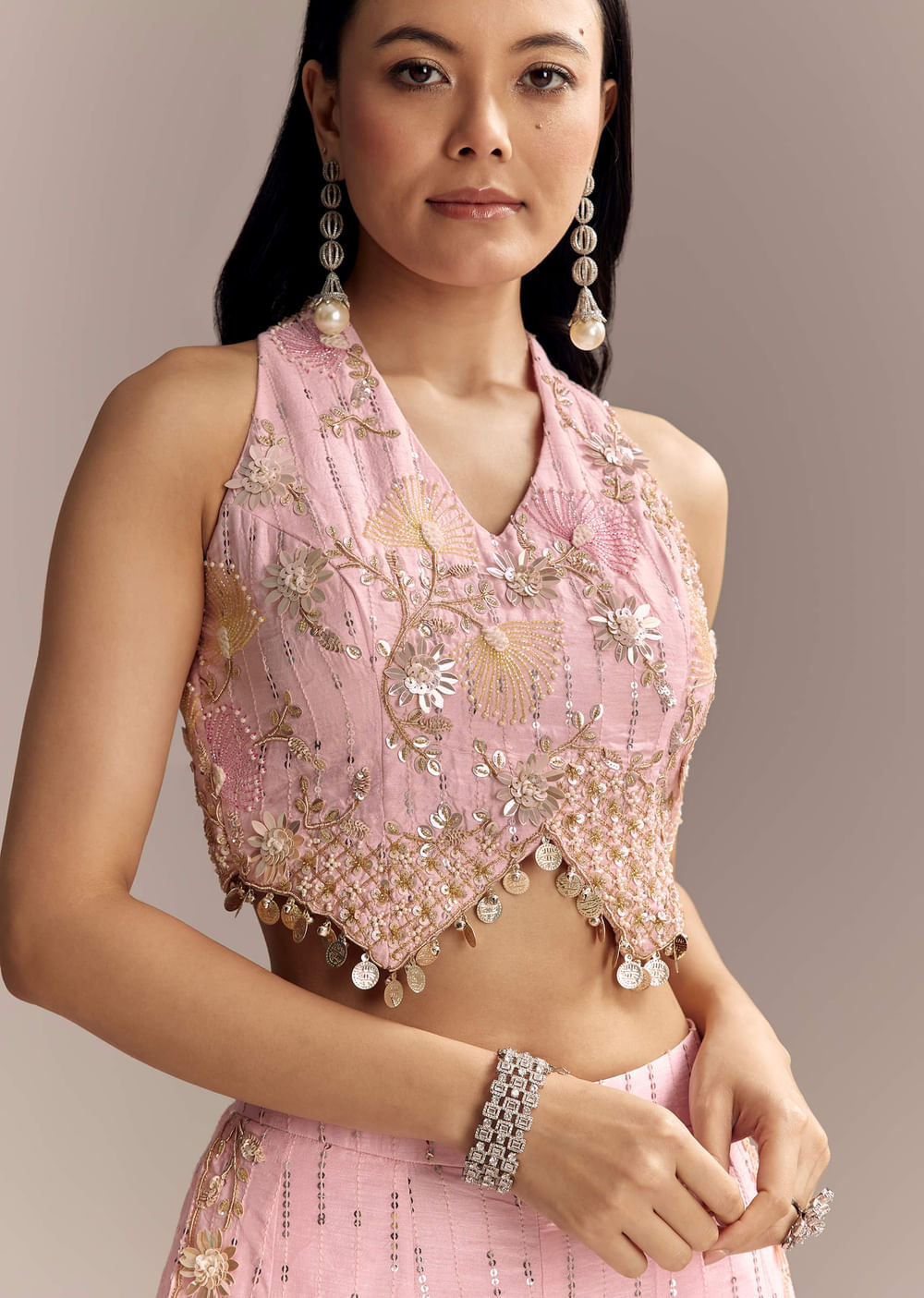 Baby Pink Silk Crop Top And Palazzo Set With Intricate Embroidery