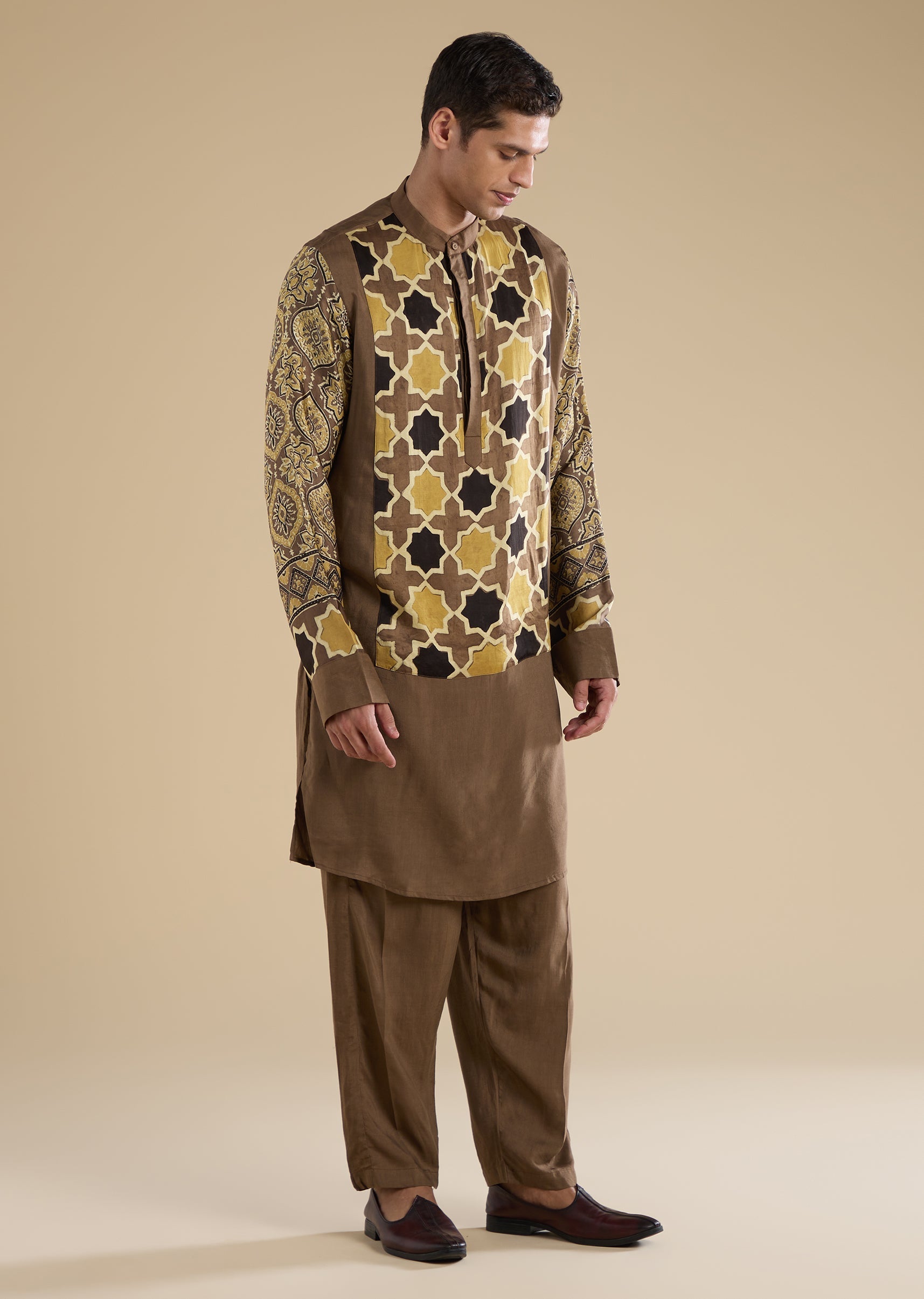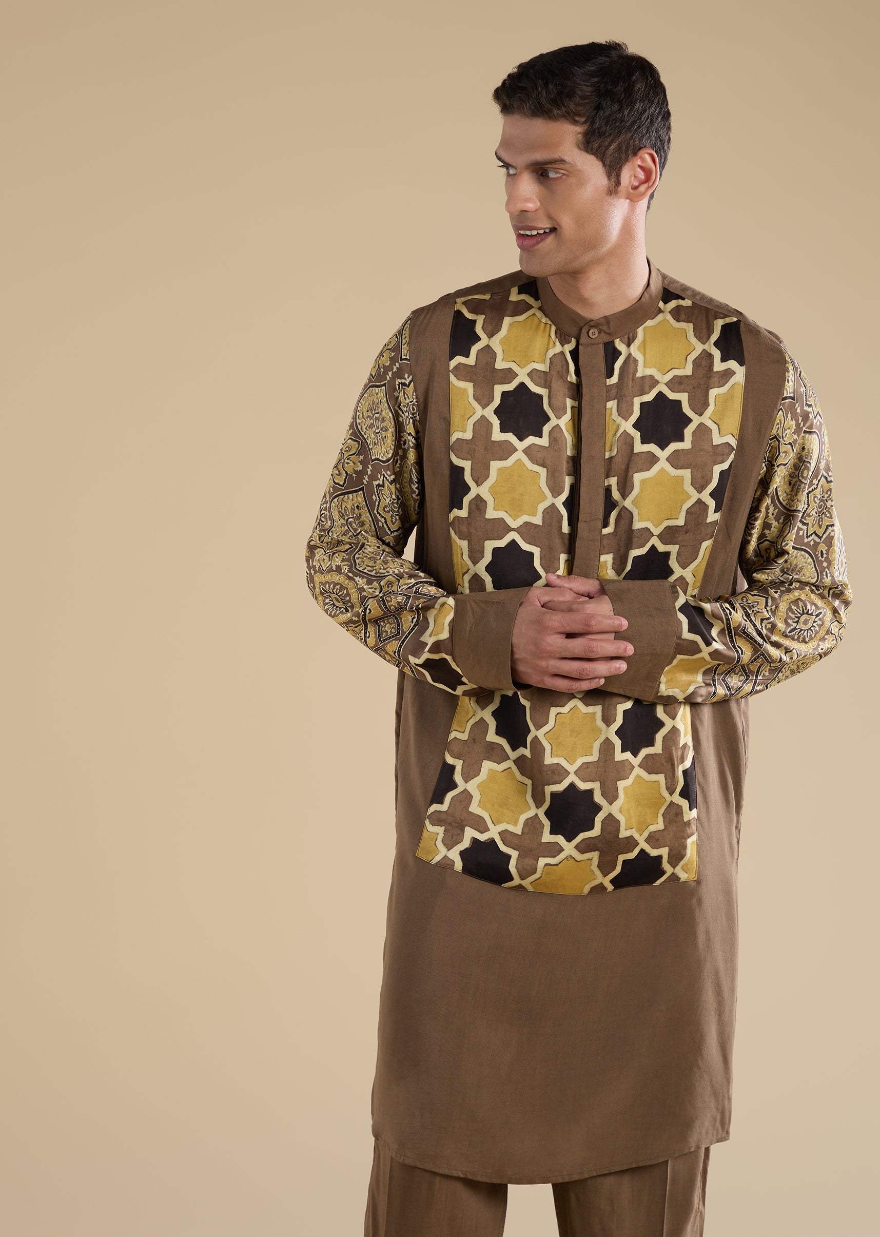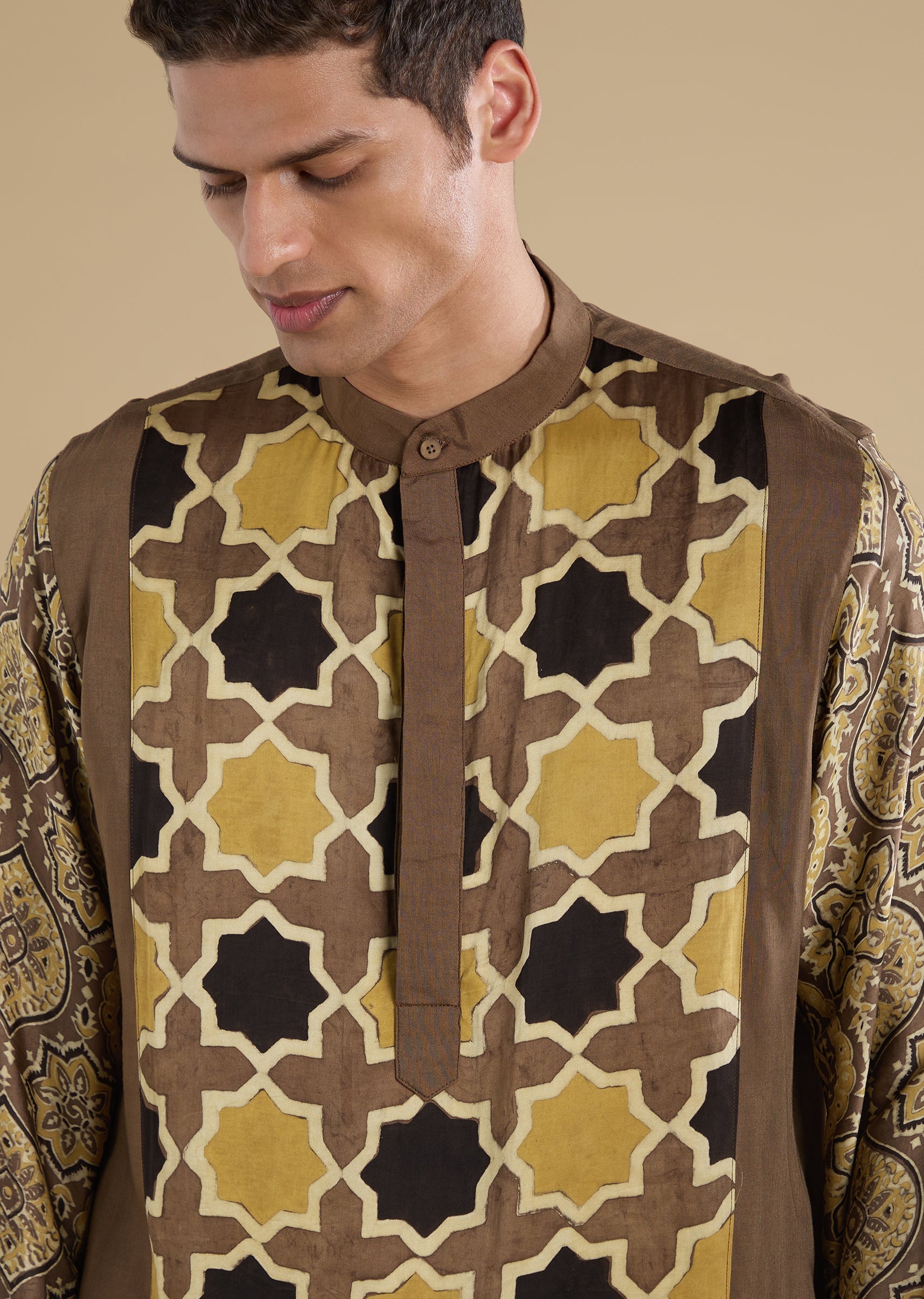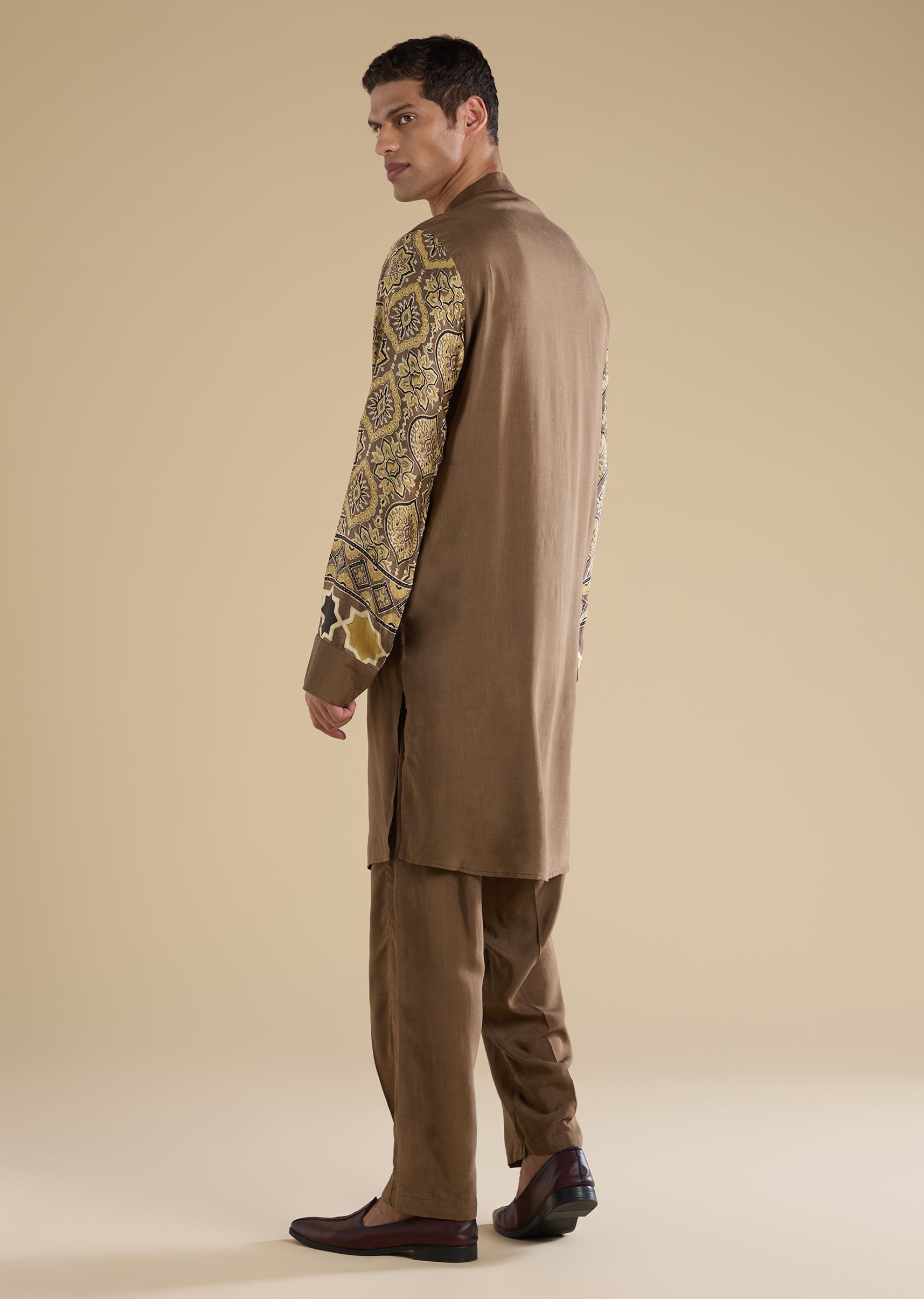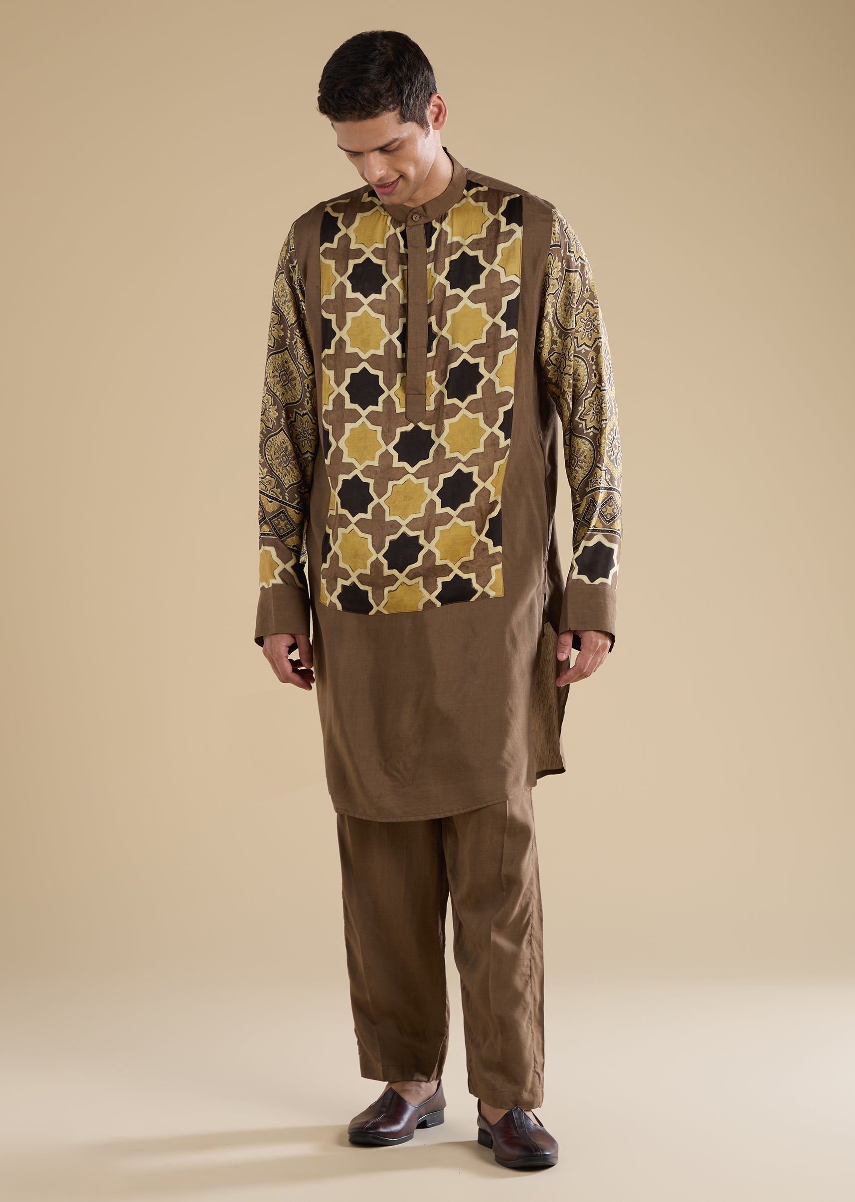 Soft and understated with artisanal charm, this beige kurta set features pure handblock Ajrakh print on breathable modal fabric. Designed with a mandarin collar, full sleeves, and side slits, it... More Product Details