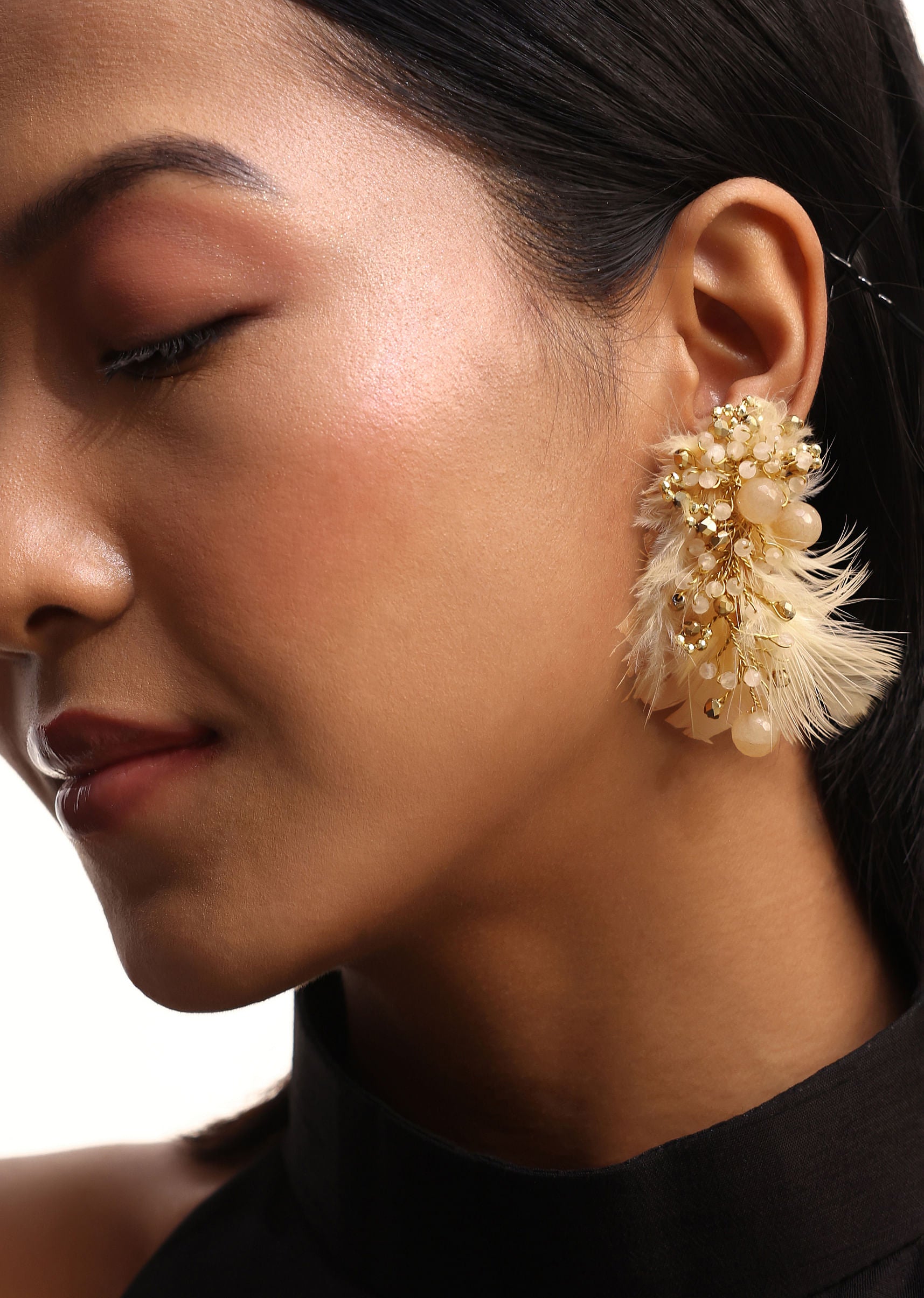 Pair Beige and Gold Handcrafted Stud Earrings with a sleek updo and a deep-neckline blouse for an elegant touch.