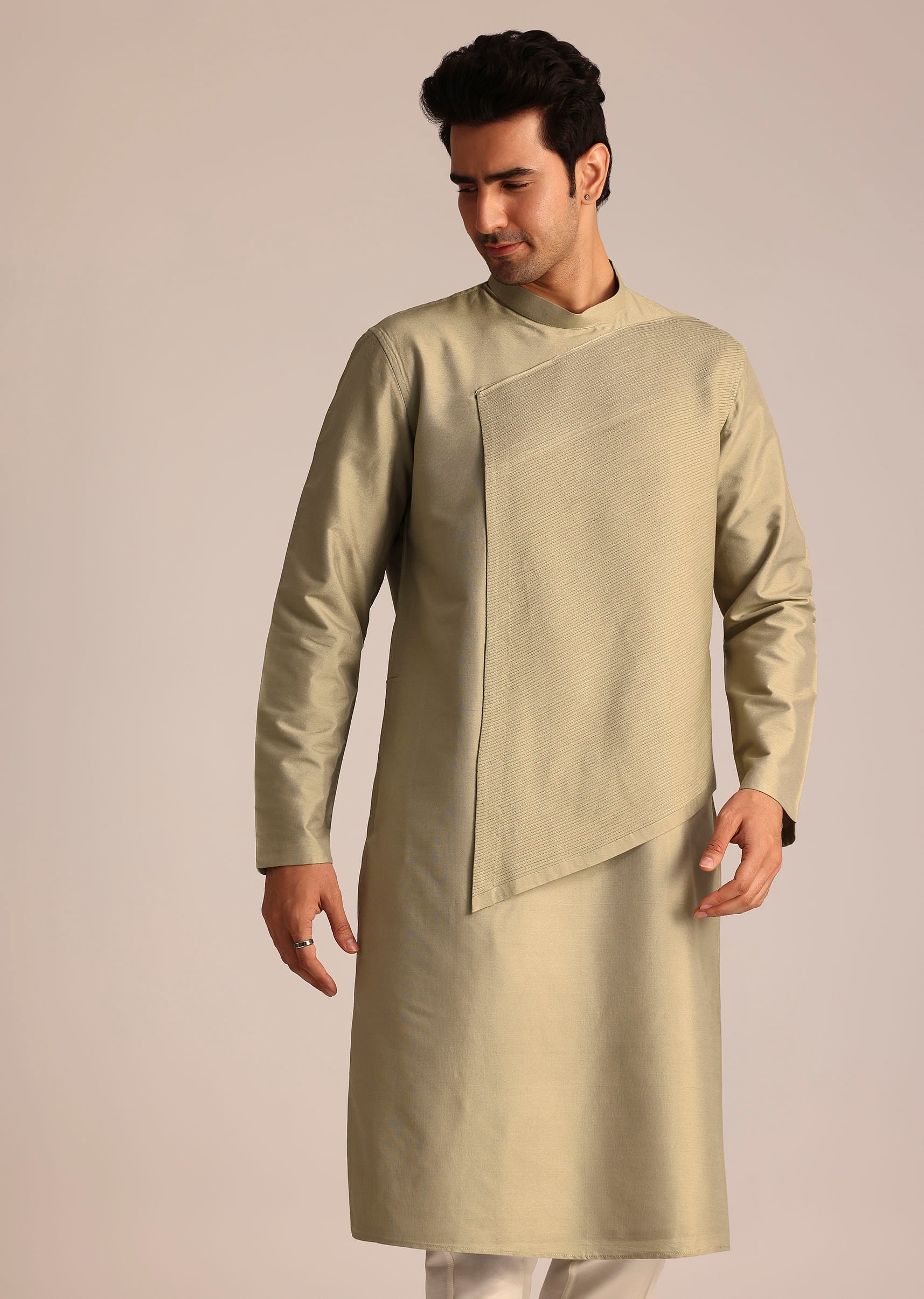 Embrace A Modern Twist On Tradition With This Beige Asymmetric Kurta Set Where Sleek Lines Meet Subtle Texture. The Unique Crosspanel Design And Tailored Silhouette Exude Understated Elegance Perfect For Festive Gatherings Sangeet Celebrations Or Contemporary Wedding Soirées. This Ensemble Is A Statement Of Refined Sophistication For The Modern Gentleman. Awarded as the Most Trusted Brand, we're delivering styles you love, just as promised.