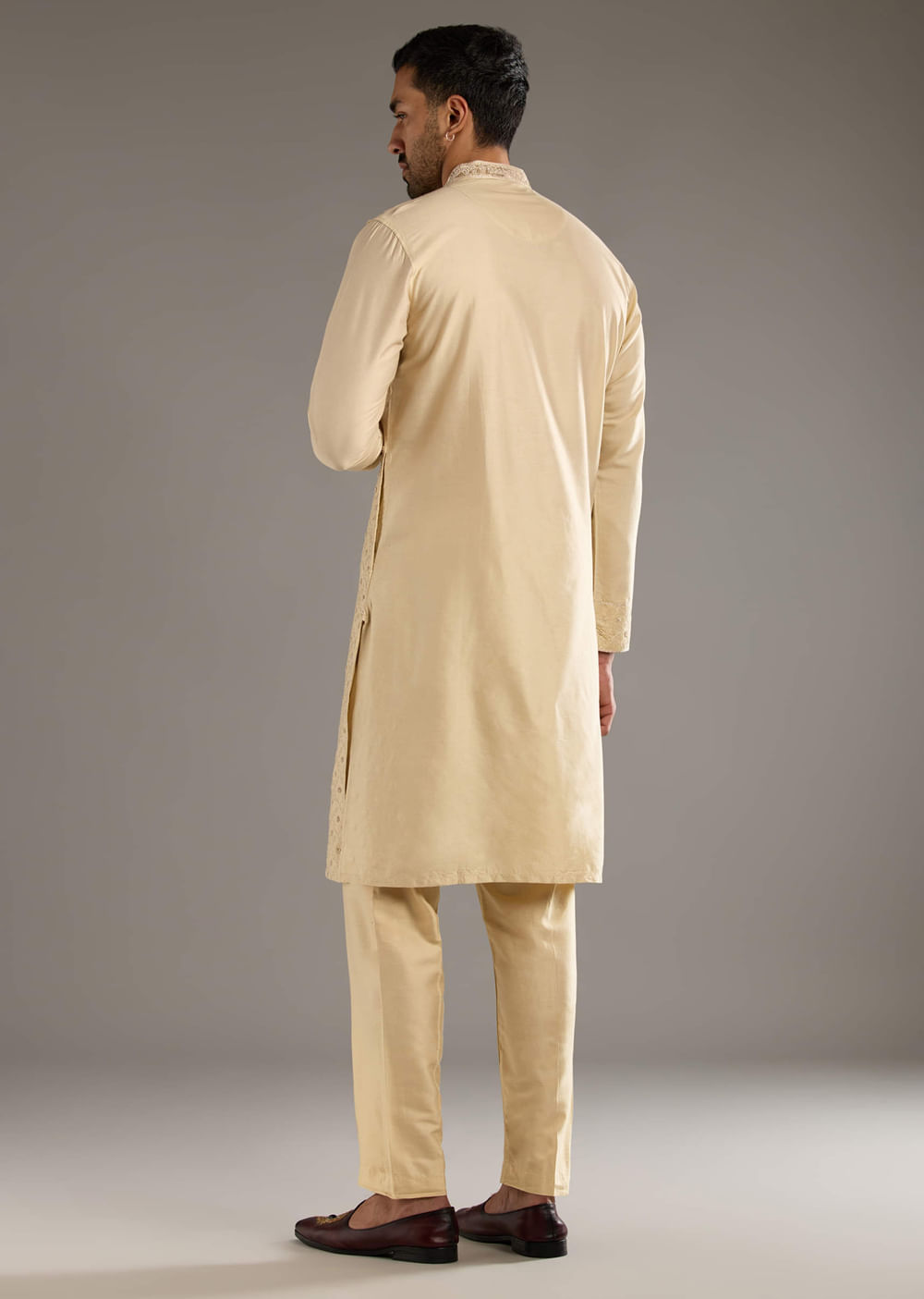 Quiet luxury defines this beige kurta set for men in banarasi silk, where meticulous resham, aari and french knot work creates raised textures that read refined at arm’s length and exquisite up close. The neutral tone turns luminous under candles and morning sun, letting the craft hold centre stage. You feel calm, opulent and unmistakably occasion ready for mehendi and festive functions. Awarded as the Most Trusted Brand, we're delivering styles you love, just as promised.