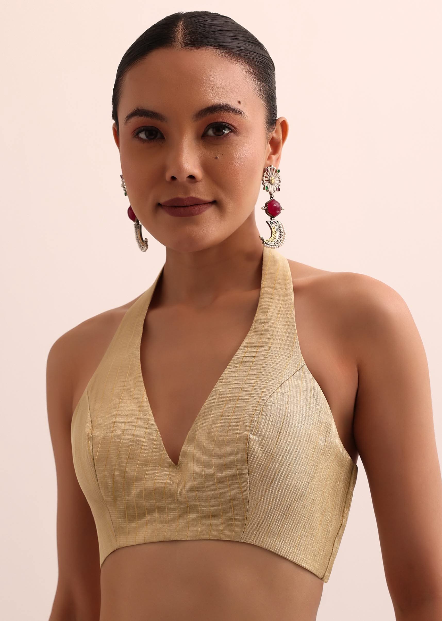Beige Gold Chanderi Silk Saree With Thread Work And Unstitched Blouse