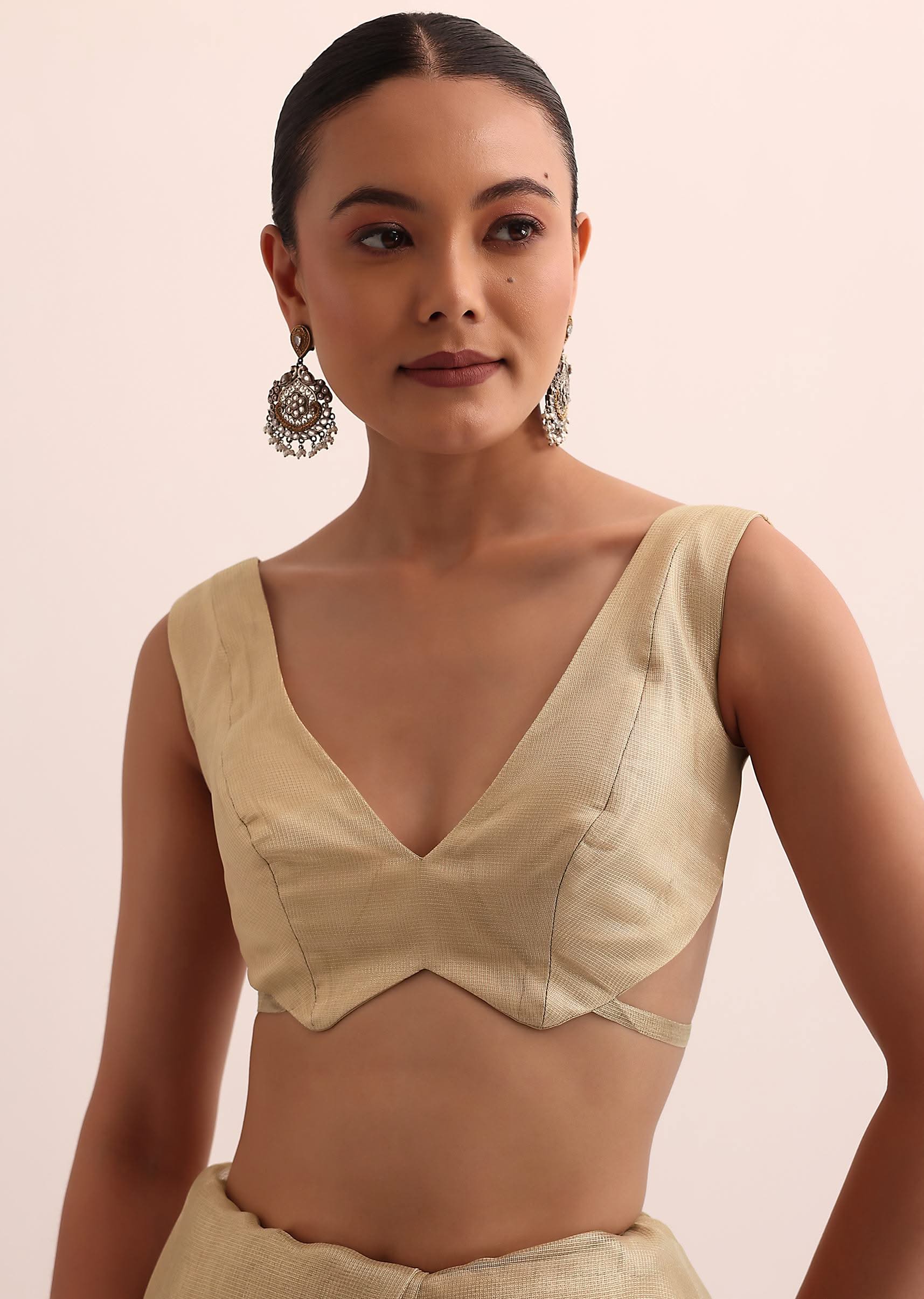 Beige Chanderi Silk Saree With Thread Work And Unstitched Blouse