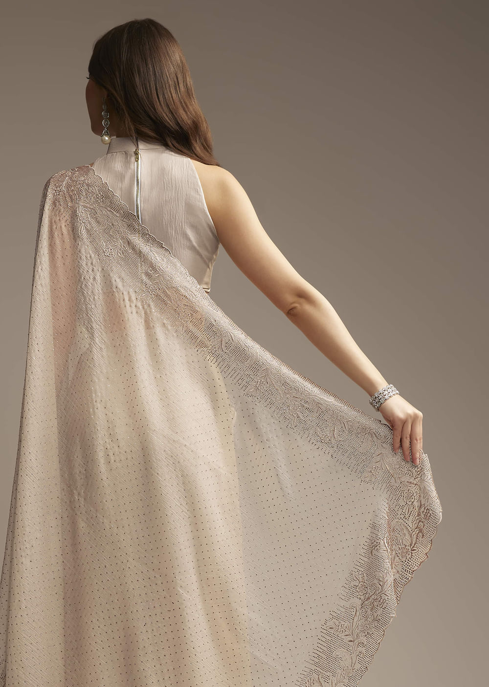Pair it with metallic heels and crystal drop earrings to echo the sparkle in the saree. For a more modern mood, go for a sculpted bun and nude lips.