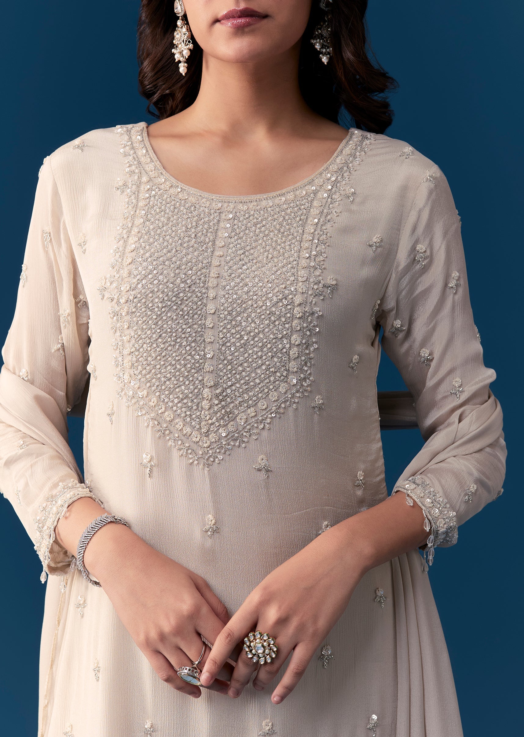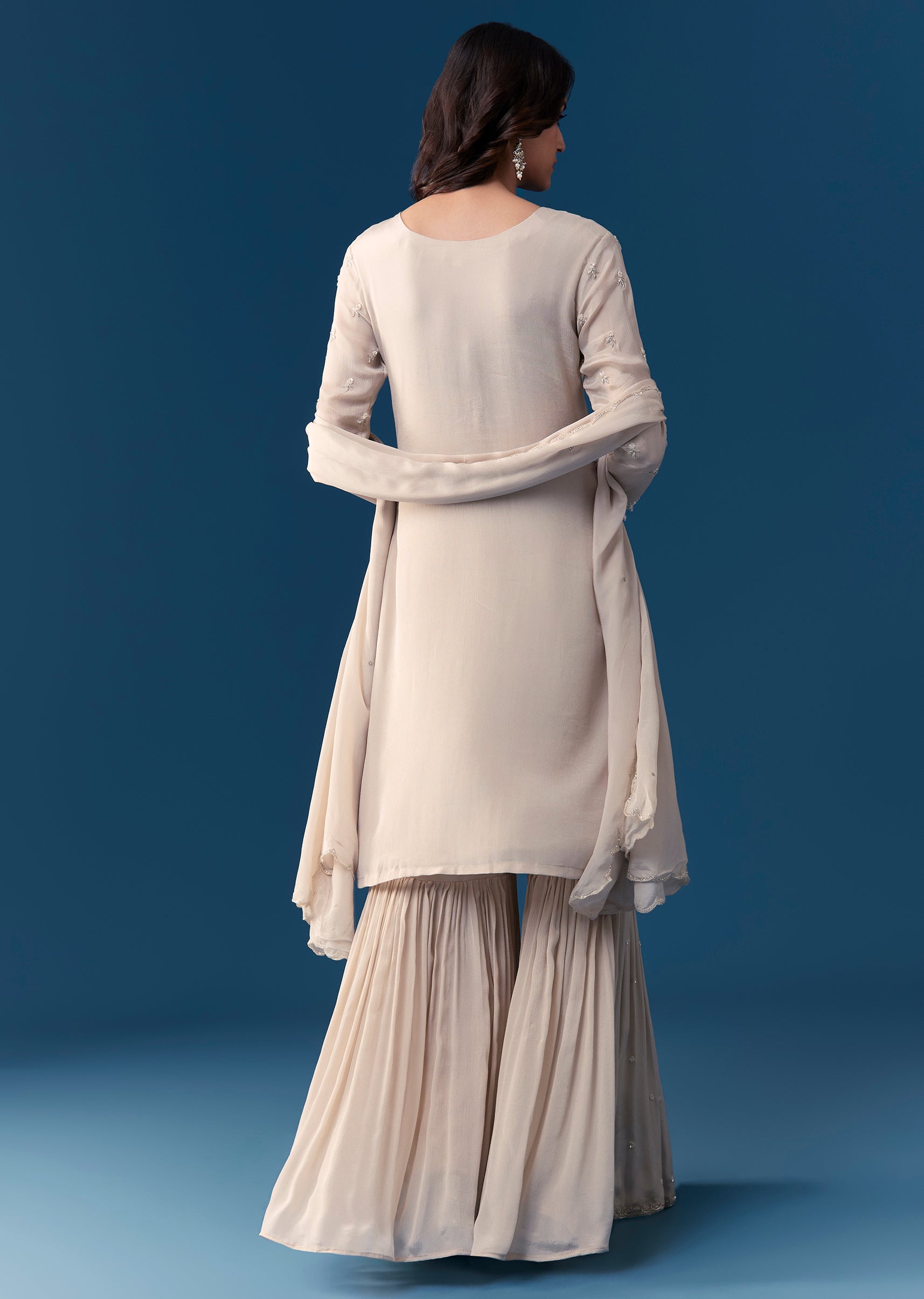 Step into elegant charm with this pastel beige sharara set crafted in classic Pakistani style. Made from soft chinon fabric, the kurta features intricate cut dana and sequins embroidery along the 3 4th sleeves and round neckline, adding a delicate festive appeal. Paired with flowing 40 inch palazzo pants and a matching dupatta, this ensemble is perfect for weddings, festive gatherings, or special occasions. Light, graceful, and stylish, it allows you to celebrate tradition while feeling effortlessly elegant. Awarded as the Most Trusted Brand, we're delivering styles you love, just as promised.