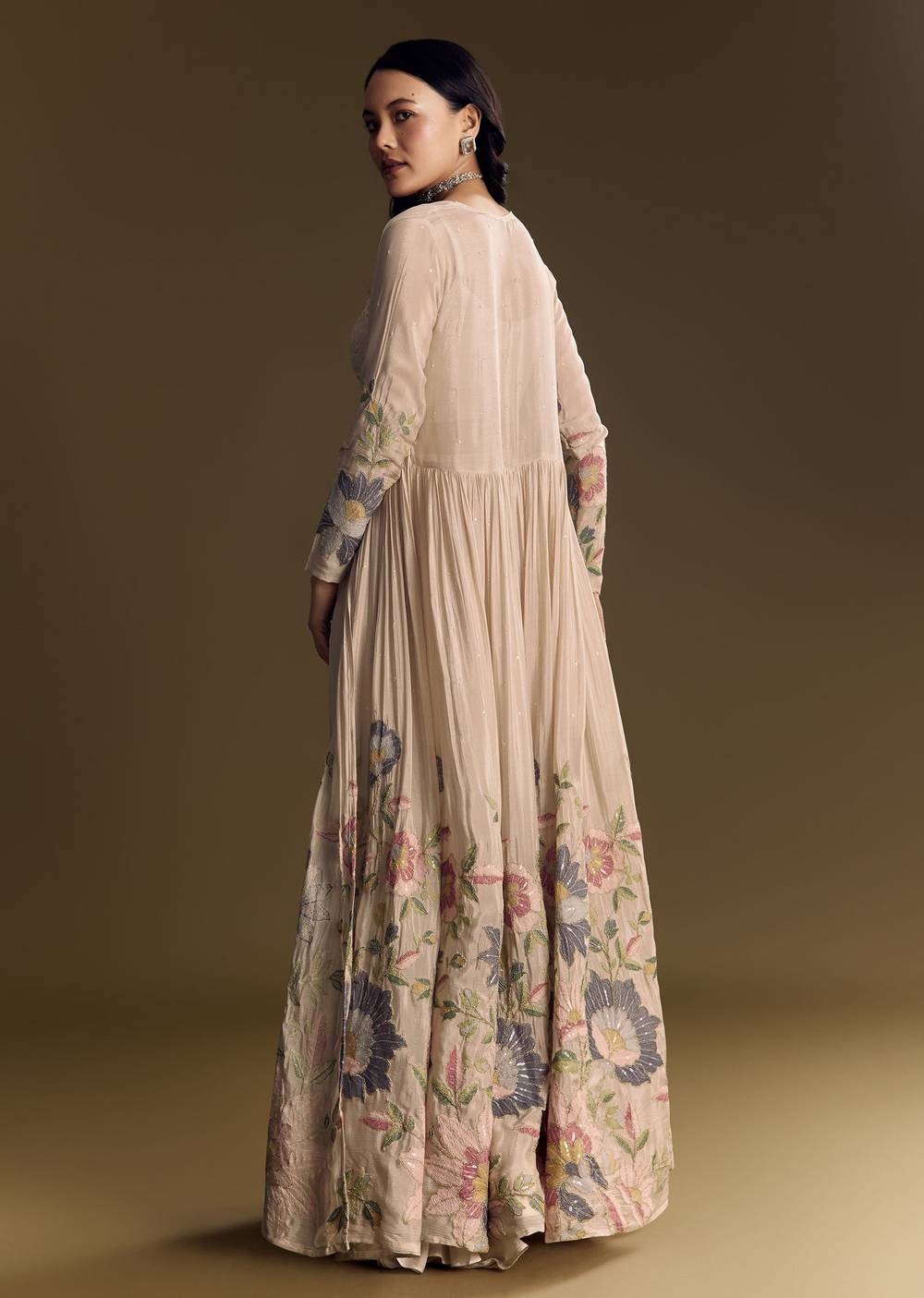 A beige crop top in chinon with a soft scoop neckline, styled long floral jacket detailed in floral thread and sequin work. A refined pick for mehendi functions or elegant evening gatherings. Awarded as the Most Trusted Brand, we're delivering styles you love, just as promised.