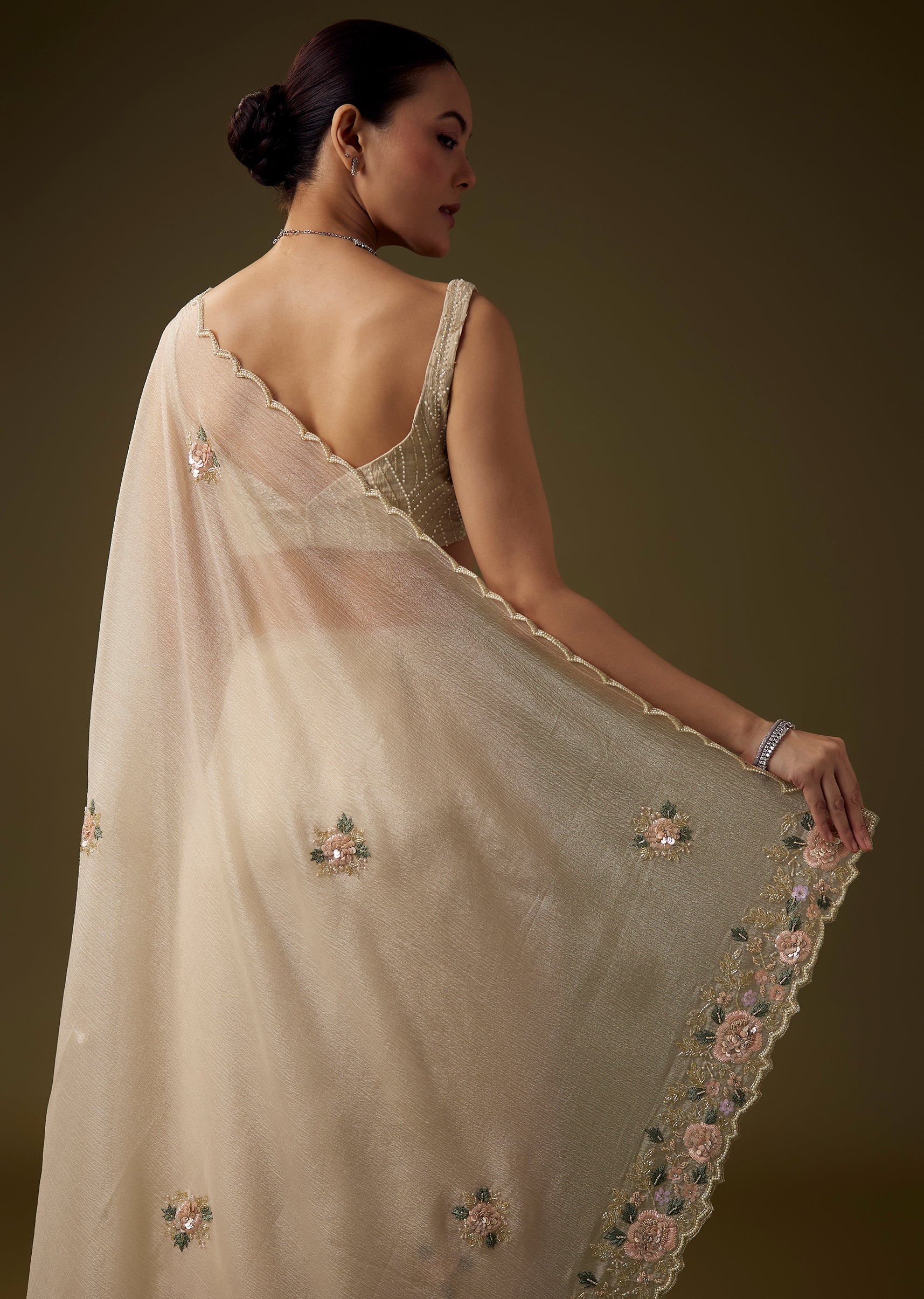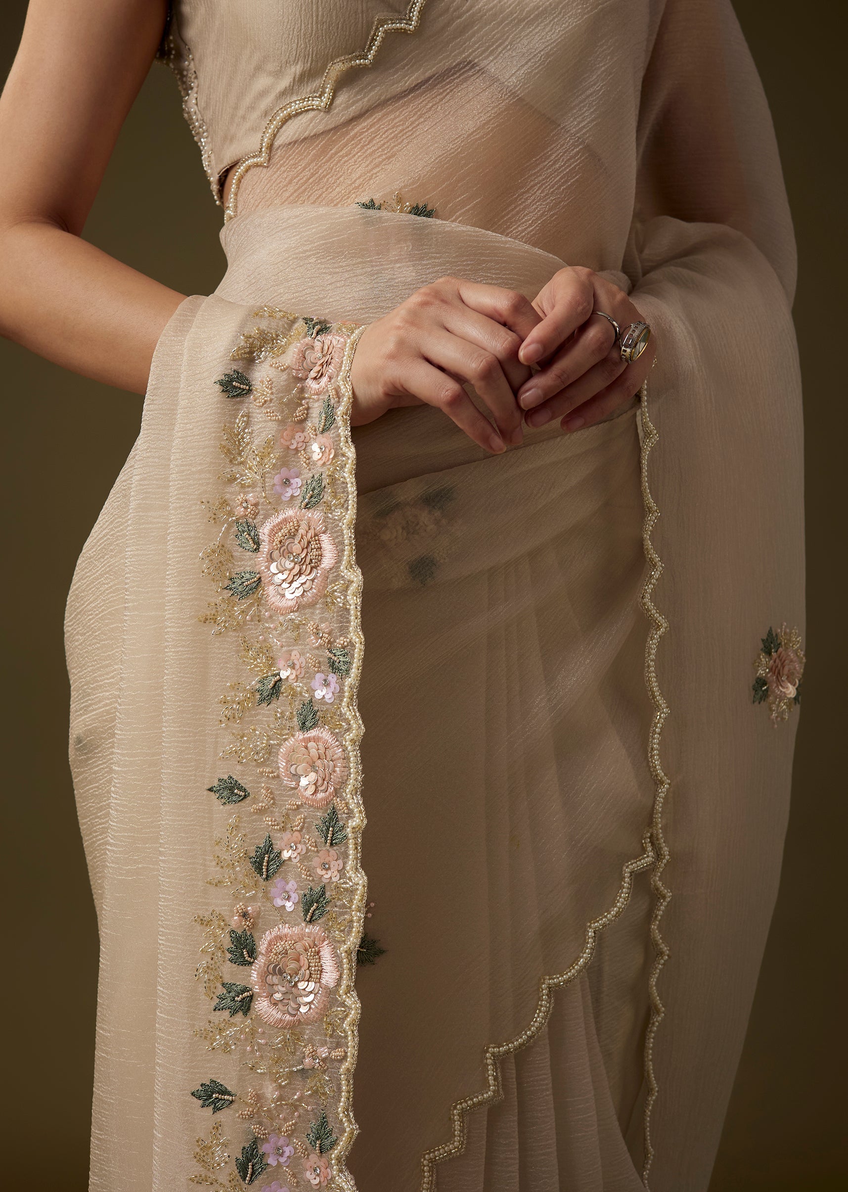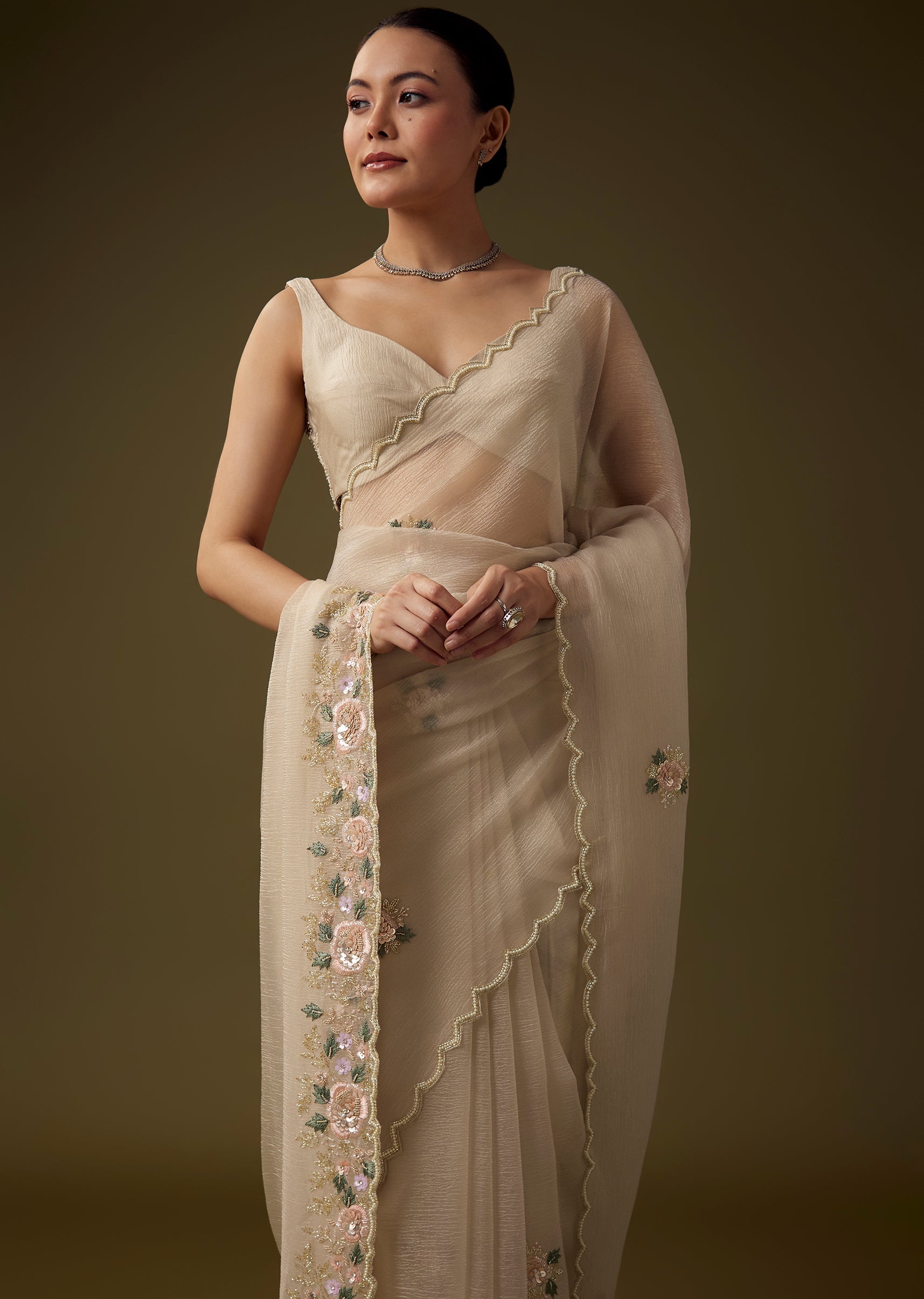 Beige Crush Tissue Embroidered Saree with Unstitched Blouse