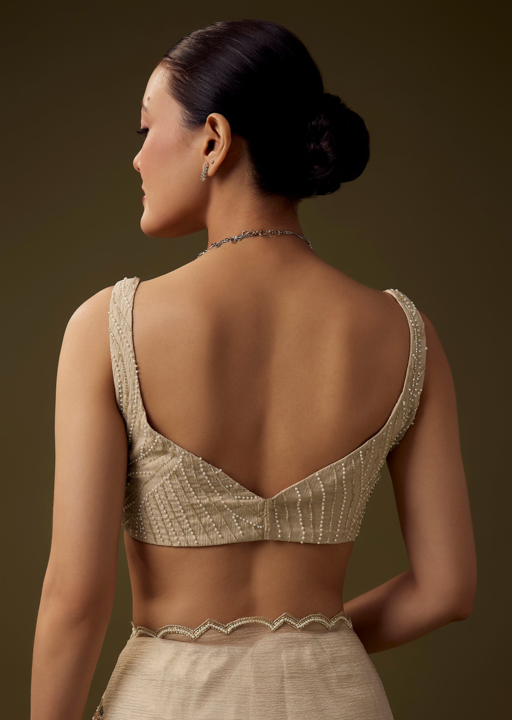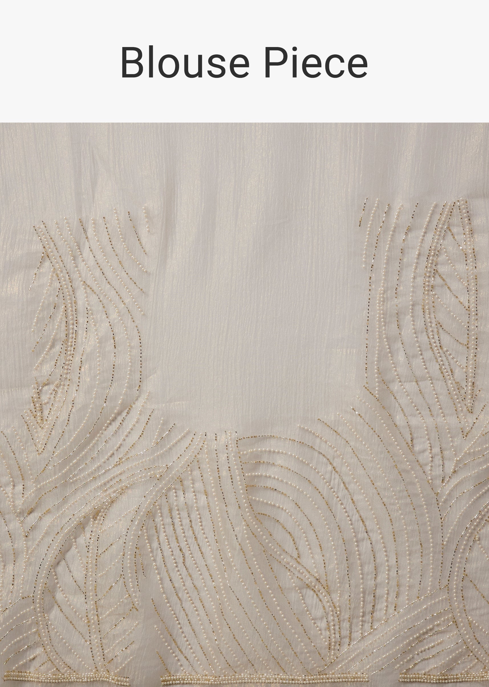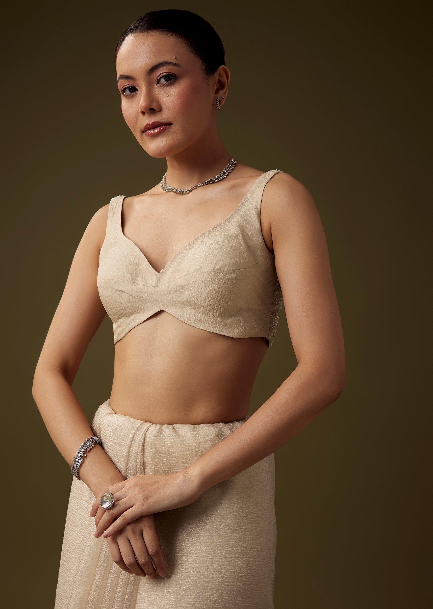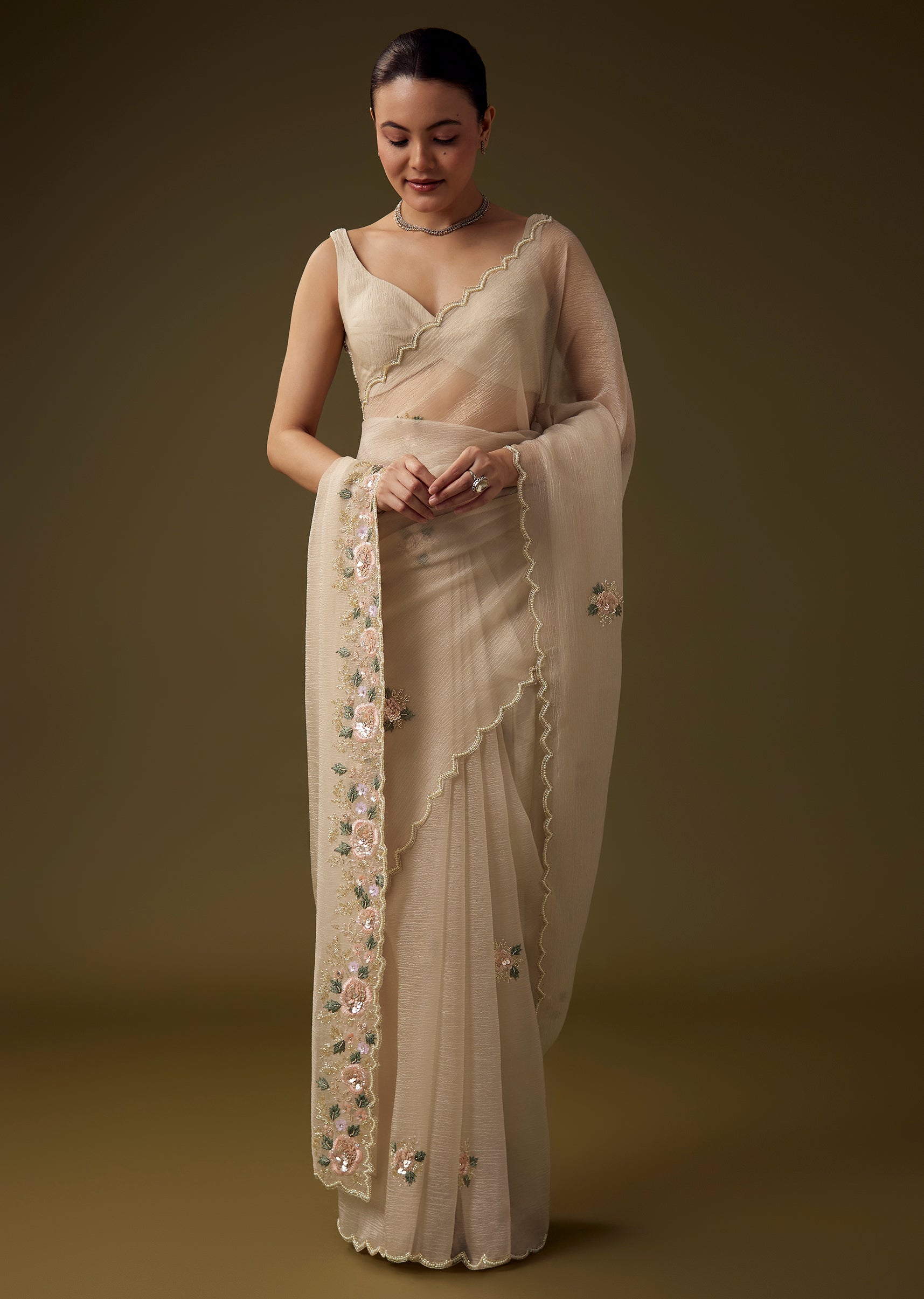 Beige Crush Tissue Embroidered Saree with Unstitched Blouse