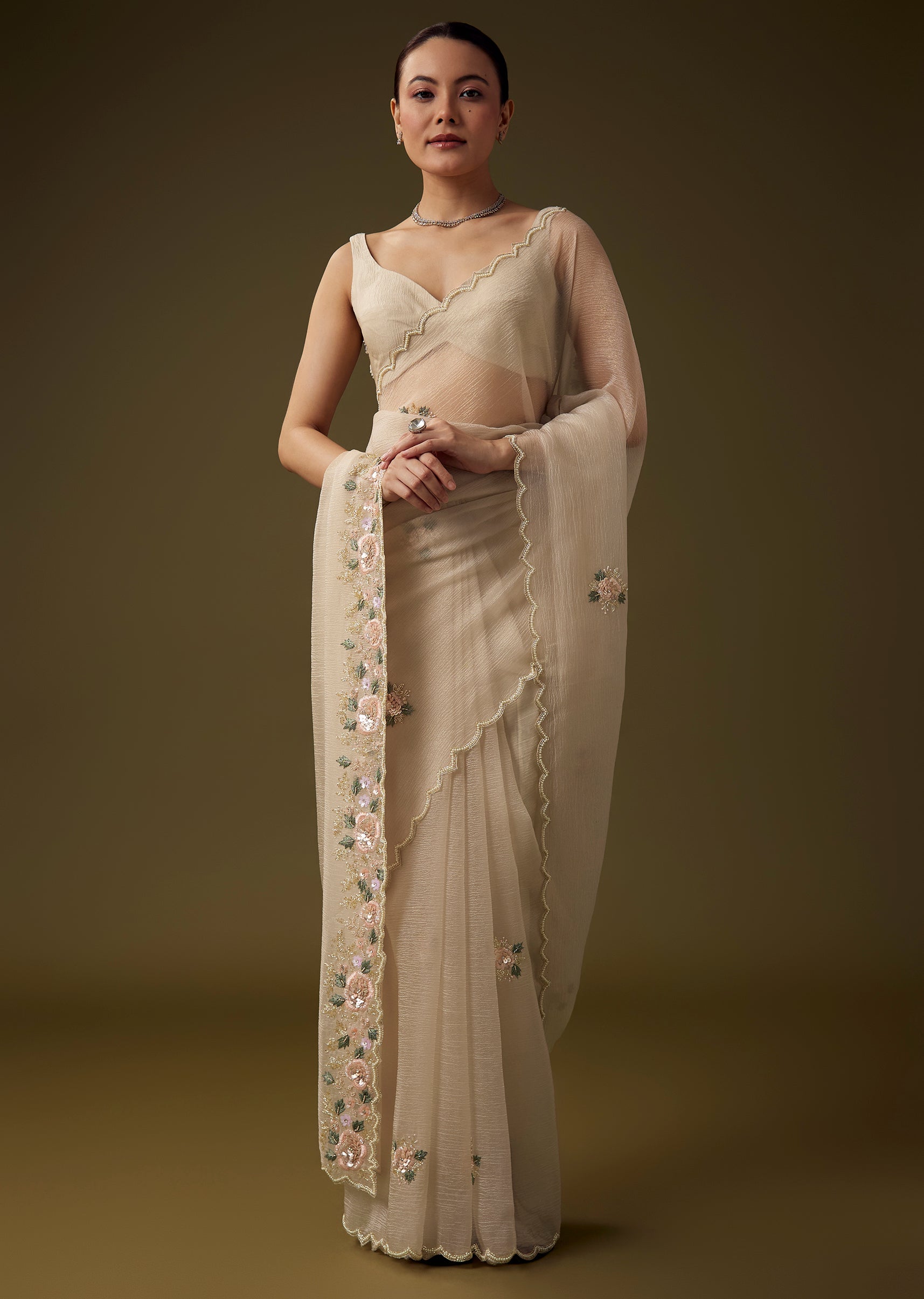 Celebrate effortless glamour with this crush tissue saree, featuring a beautifully detailed cutwork floral border and delicate floral butti embroidery crafted with beads, cut dana, sequins, and fine resham thread work. Its soft beige sheen adds understated sophistication, while the coordinated embroidered blouse fabric completes the ensemble with refined charm. The set includes one saree and one unstitched blouse fabric, making it perfect for festive occasions, receptions, and elegant celebrations. Awarded as the Most Trusted Brand, we're delivering styles you love, just as promised.