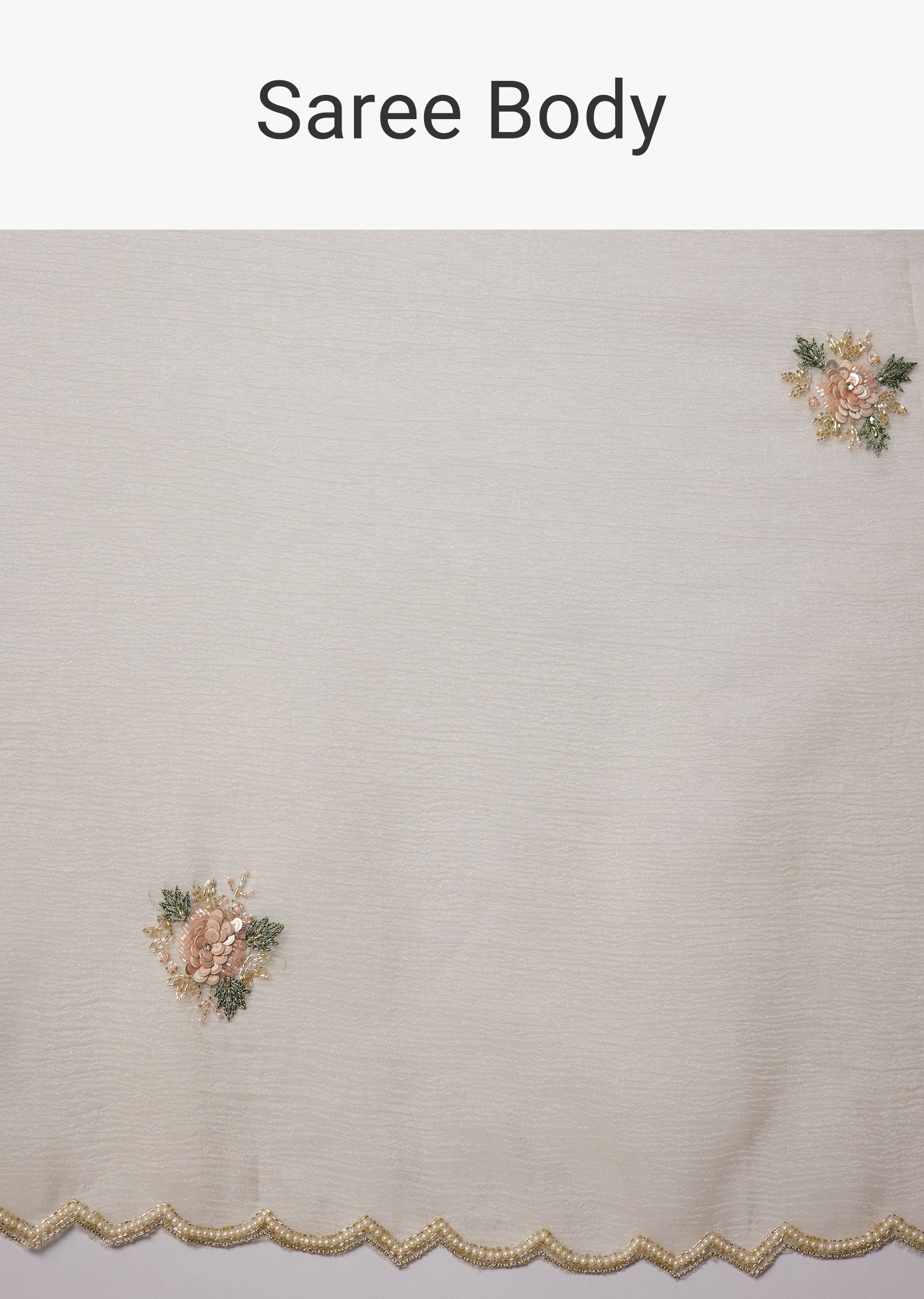 Celebrate effortless glamour with this crush tissue saree, featuring a beautifully detailed cutwork floral border and delicate floral butti embroidery crafted with beads, cut dana, sequins, and fine resham thread... More Product Details