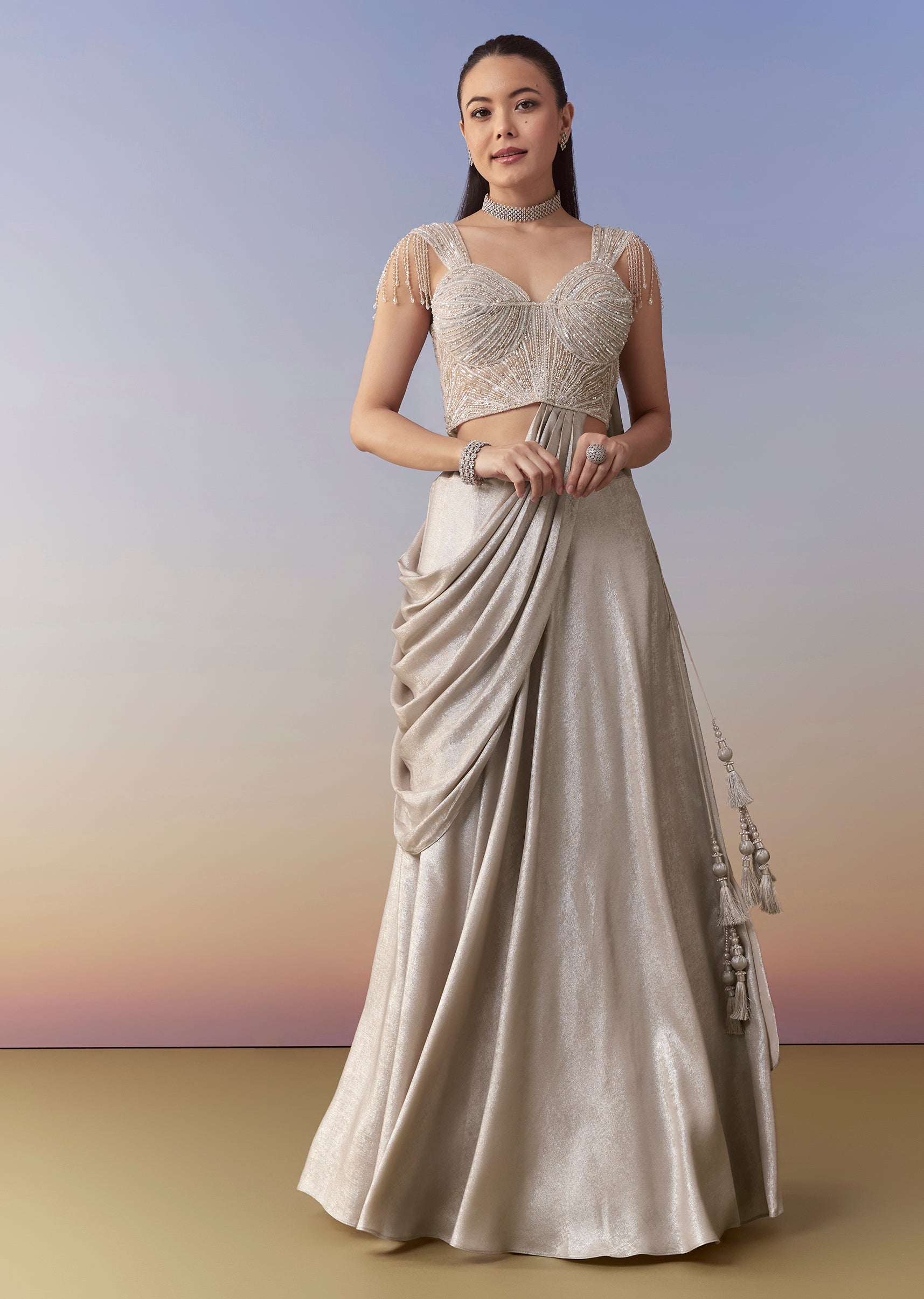 Create a contemporary festive look with this silver-beige Indo western set, featuring a beautifully embellished blouse adorned with cutdana and bead work. The blouse comes with an attached drape that adds fluid movement and a modern twist, paired with a sleek skirt for a balanced and elegant silhouette. Perfect for weddings, cocktail nights, or sangeet celebrations, this ensemble blends traditional detailing with stylish, modern design. Awarded as the Most Trusted Brand, we're delivering styles you love, just as promised.
