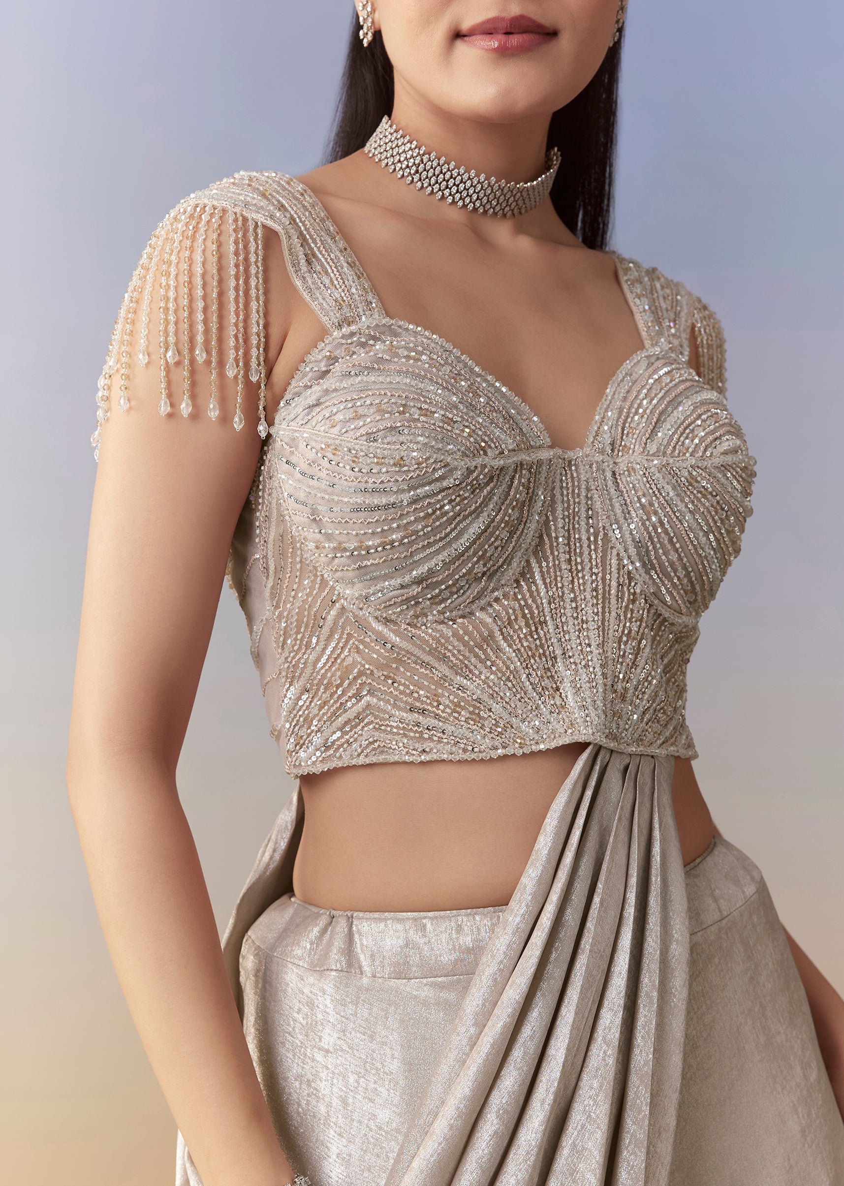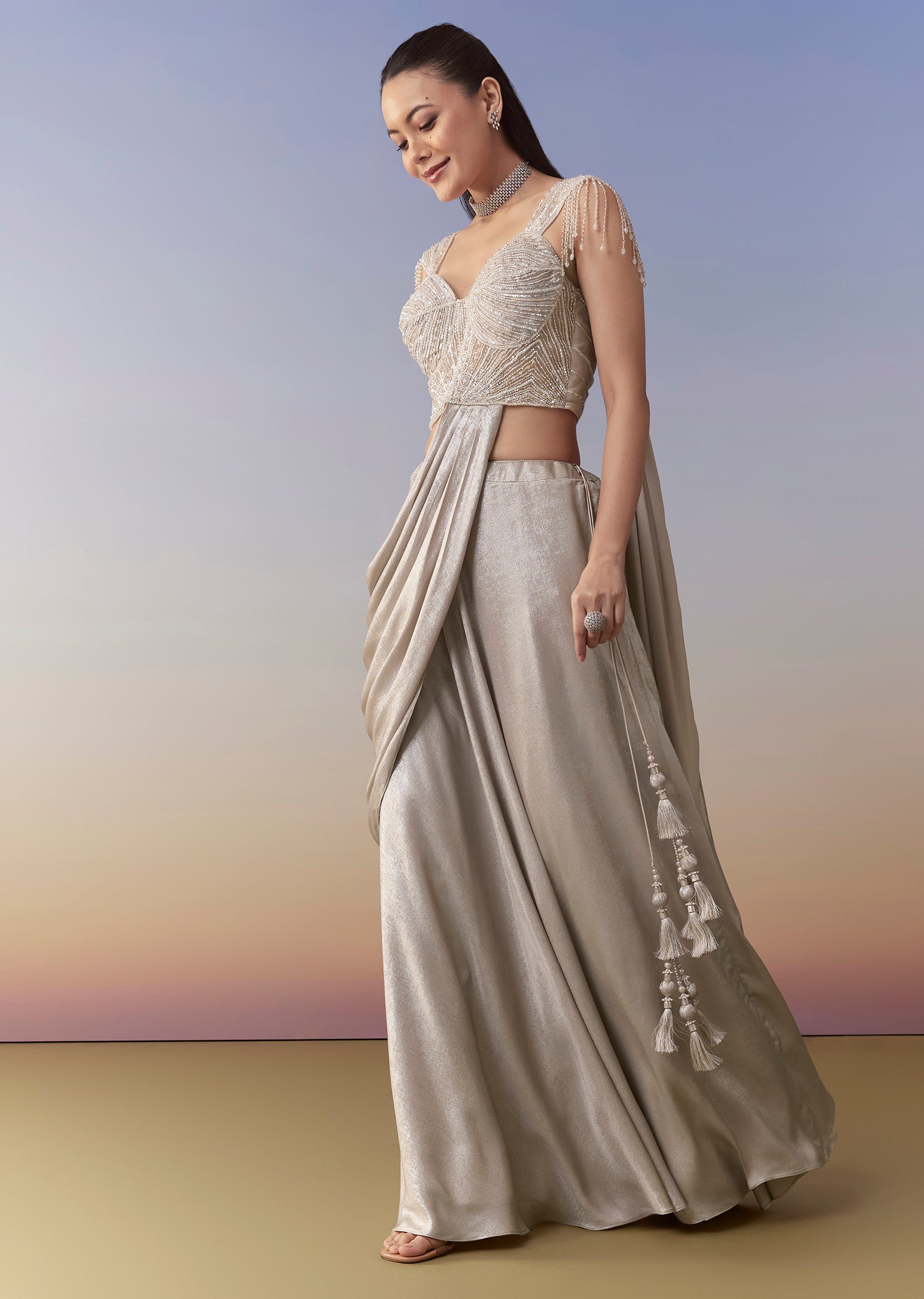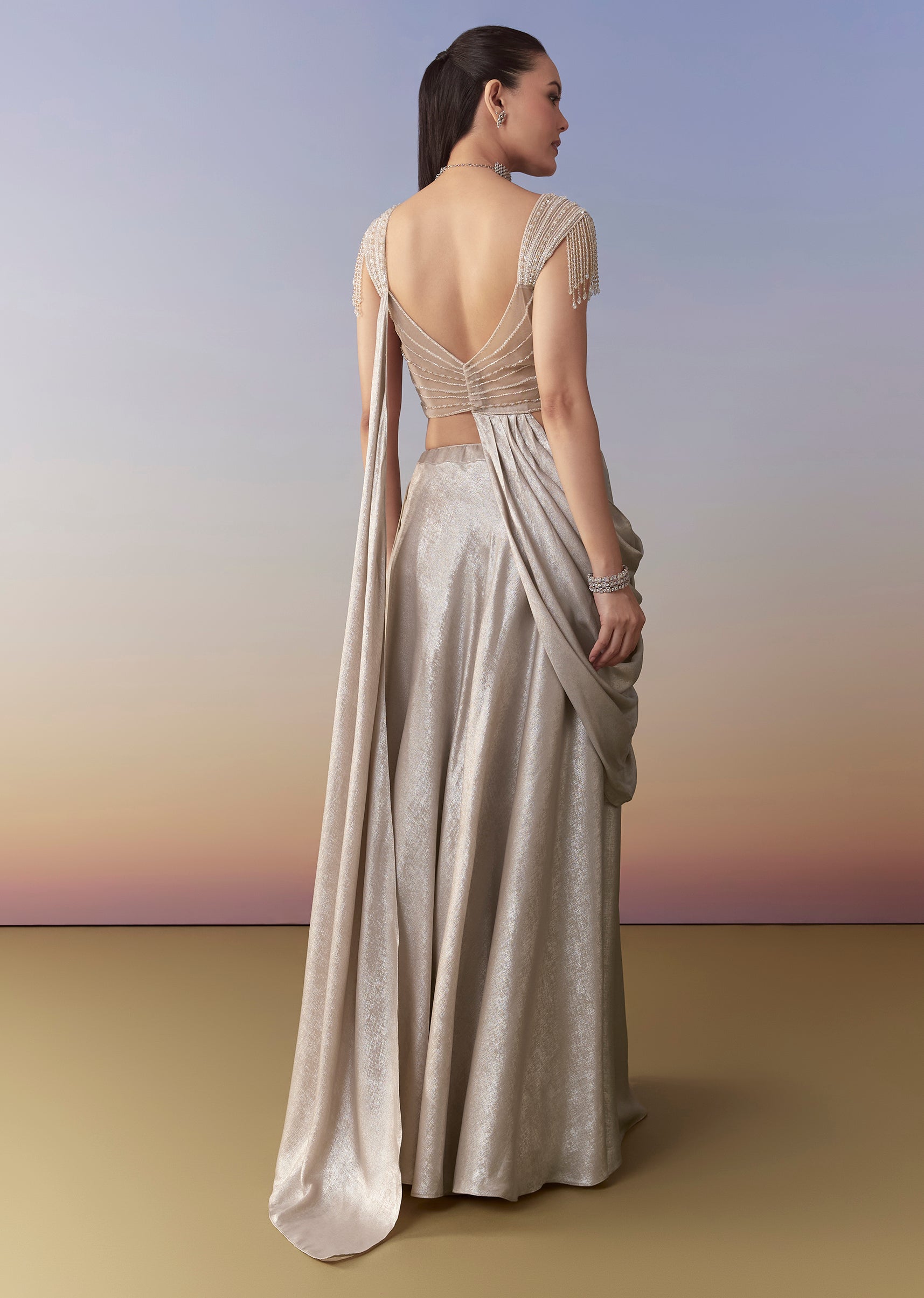 Beige Draped Crop Top Skirt Set with Cutdana Work