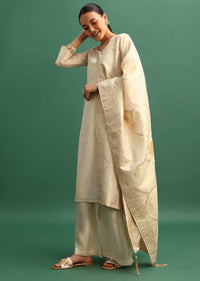 Drift away in ethereal elegance. This breathtaking beige tissue kurta palazzo set is a masterpiece of craftsmanship. Delicate Zardosi embroidery dances alongside shimmering sequins all woven into a luxurious Banarasi... More Product Details