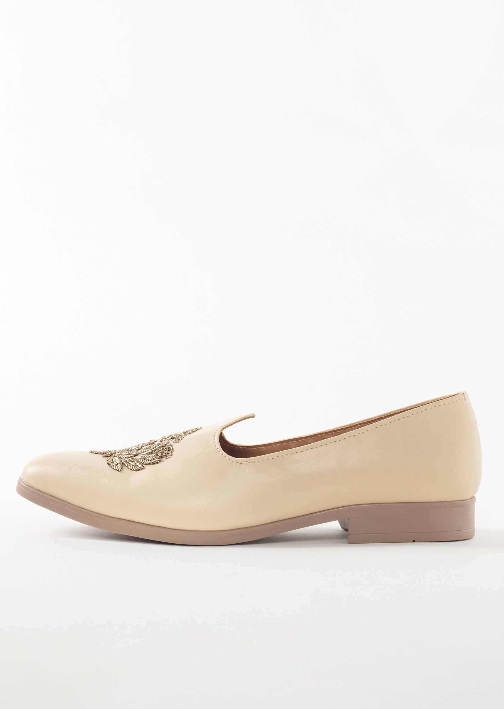 These beige ethnic juttis feature sophisticated floral embroidery on the upper that creates a premium and elegant look. The faux leather base with zari detail work enhances their refined style... More Product Details