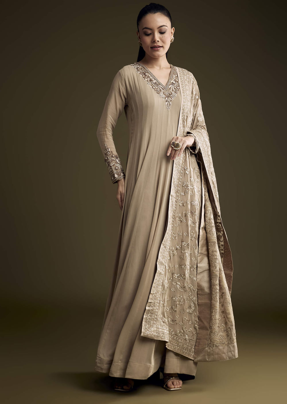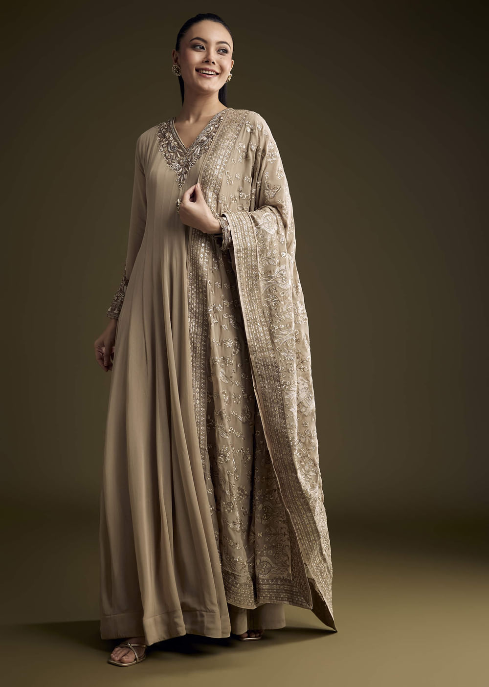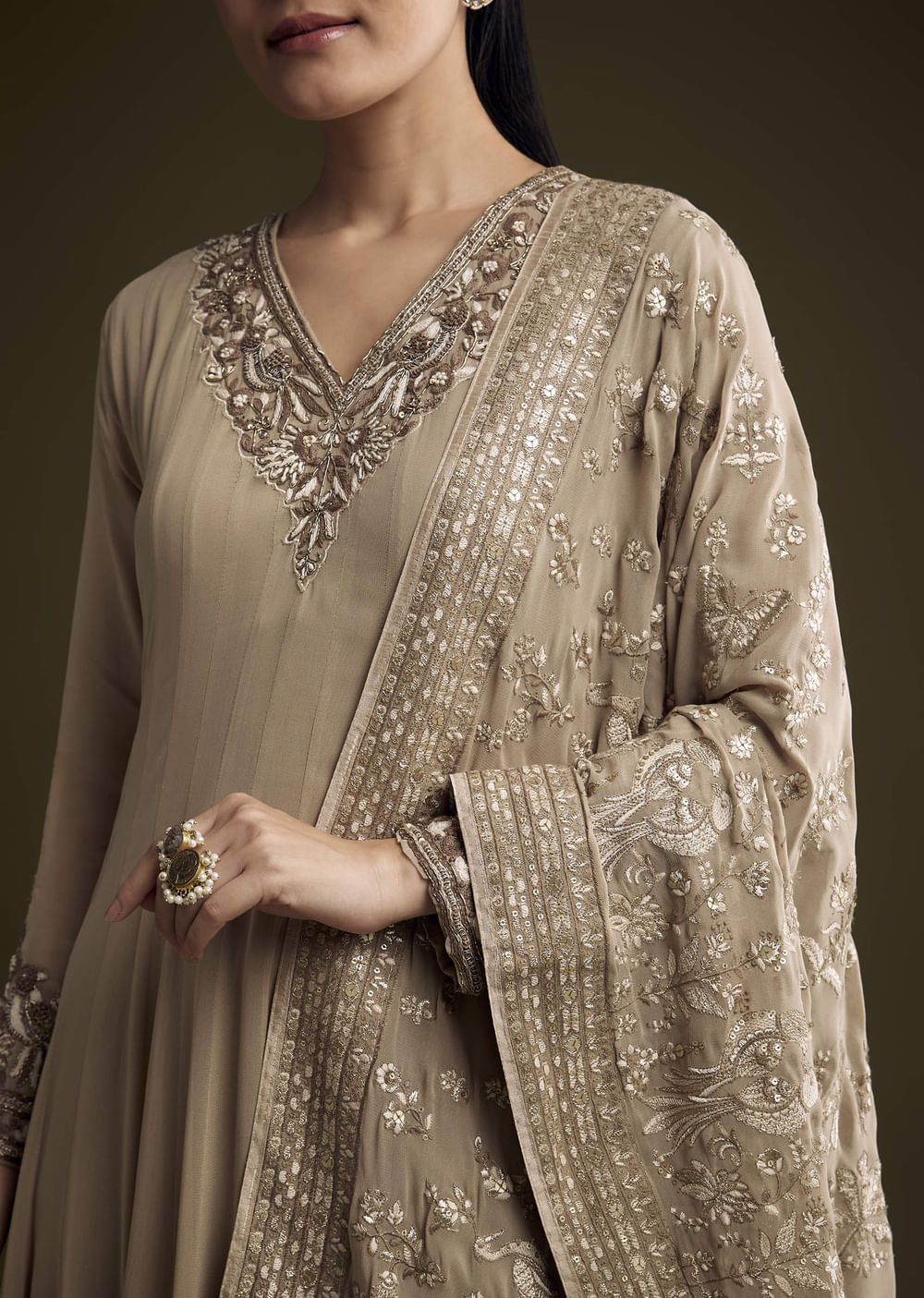 Beige Georgette Anarkali Suit With Sequins And Thread Embroidery